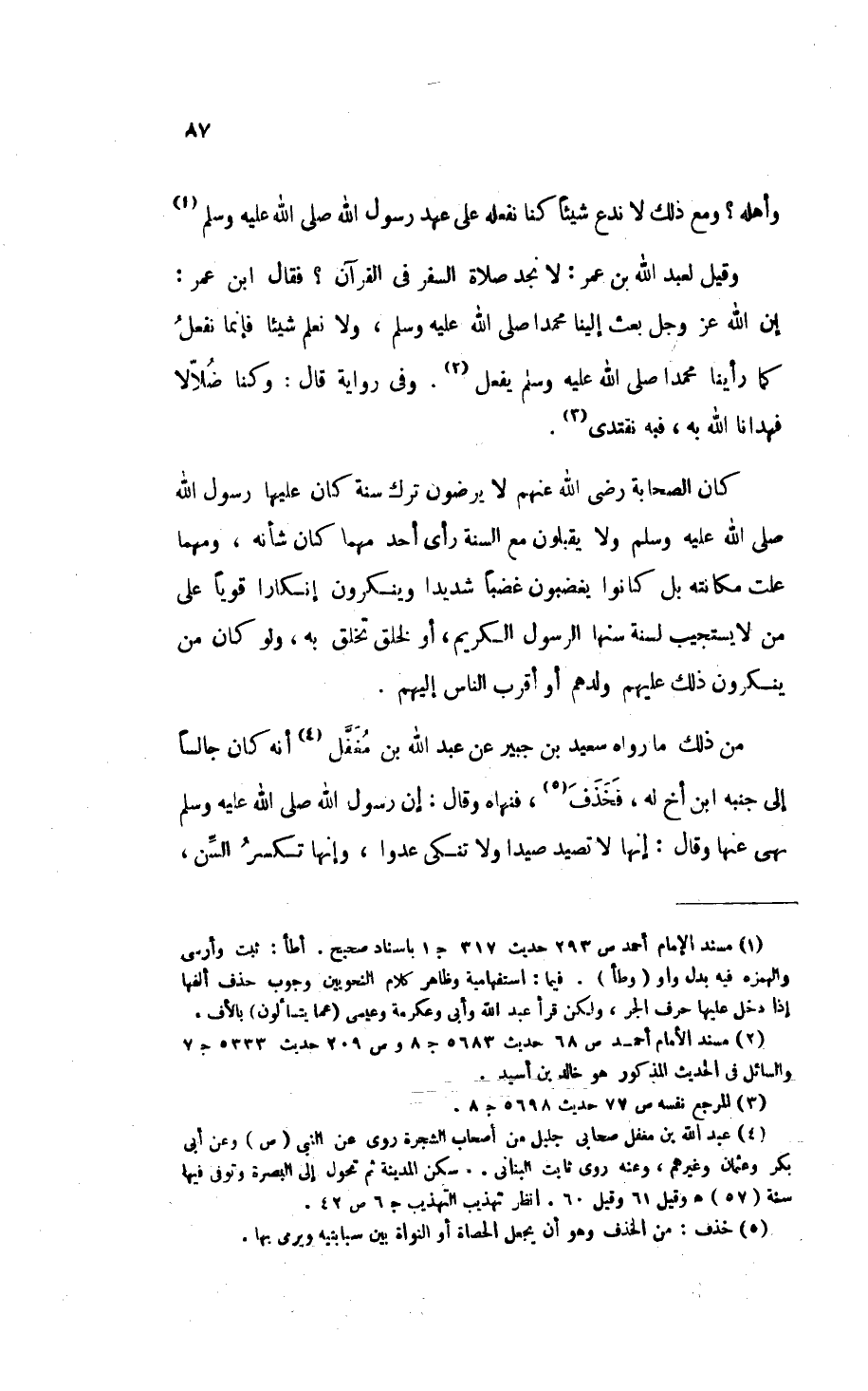 ومن ذلك ما رواه سعيد بن جُبير عَنْ عَبْدِ اللَّهِ بْنِ مُغَفَّلٍ (¬4) أَنَّهُ كَانَ جَالِسًا إِلَى جَنْبِهِ ابْنُ أَخٍ لَهُ فَخَذَفَ (¬5) فَنَهَاهُ وَقَالَ: «إِنَّ رَسُولَ اللَّهِ صَلَّى اللَّهُ عَلَيْهِ وَسَلَّمَ نَهَى عَنْهَا وَقَالَ: إِنَّهَا لاَ تَصِيدُ صَيْدًا وَلاَ تَنْكِي عَدُوًّا، وَإِنَّهَا تَكْسِرُ السِّنَّ،