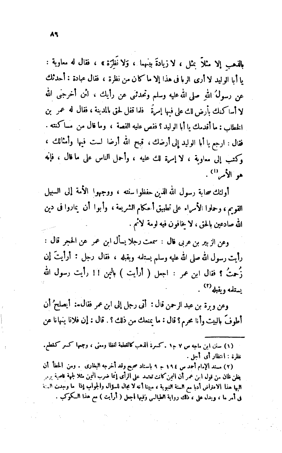 (¬2) " مسند الإمام أحمد ": ص 194 جـ 9 بإسناد صحيح وقد أخرجه " البخاري ". ومن الخطأ أَنْ يَظُنَّ ظان من قول ابن عمر أَنَّ اليمن كانت تعتمد على الرأي إنما ضرب اليمن مثلاً لجهة قاصية يرمي إليها هذا الاعتراض أَدَبًا مَعَ السُنَّةِ النَّبَوِيَّةِ، مُبيِّنًا أنه لا مجال للسؤال والجواب إذا ما وجدت السُنَّةُ في أمر ما، ويدل على، ذلك رواية " الطيالسي " وفيها: «اجْعَلْ (أَرَأَيْتَ) مَعَ [ذَلِكَ] الكَوْكَبِ».