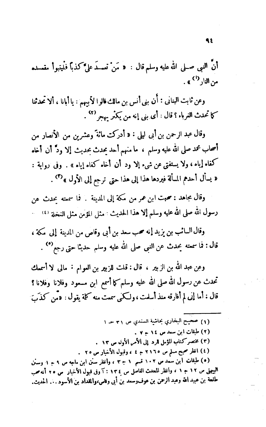(¬5) " طبقات " ابن سعد: ص 102 قسم 1 جـ 3، وانظر " سنن ابن ماجه ": ص 9 جـ 1 و" سنن البيهقي ": ص 12 جـ 1، وانظر " المحدث الفاصل ": ص 134: آوفي " قبول الأخبار ": ص 25: أَنَّهُ صَحِبَ طَلْحَةَ بْنَ عُبَيْدِ اللهِ وَعَبْدَ الرَّحْمَنِ بْنَ عَوْفٍ وَسَعْدَ بْنَ أَبِي وَقَّاصٍ، وَالمِقْدَادَ بْنَ الأَسْوَدِ ... الحديث.