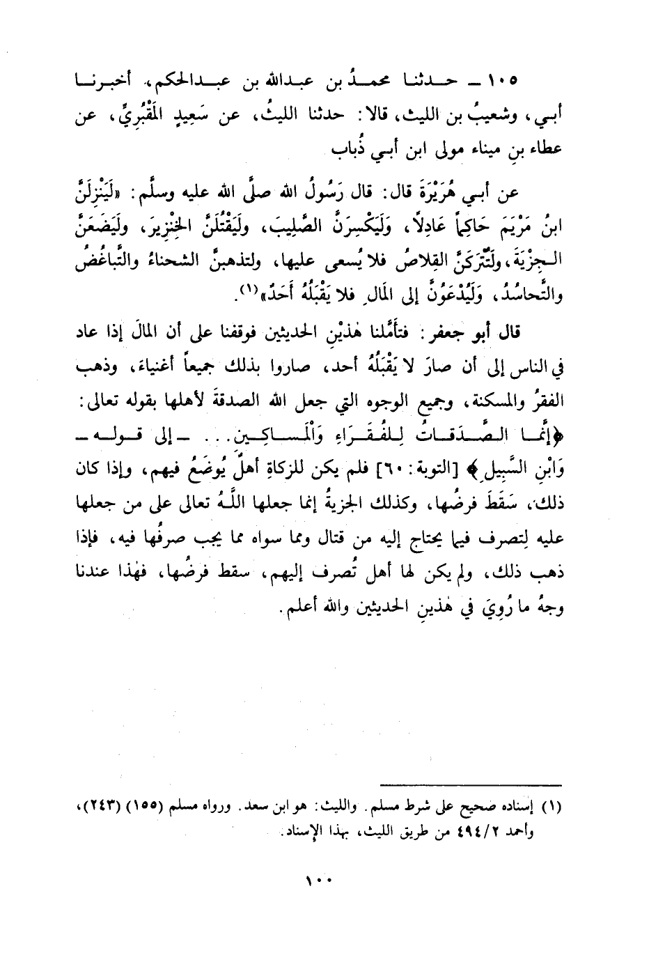 105 - حَدَّثَنَا مُحَمَّدُ بْنُ عَبْدِ اللهِ بْنِ عَبْدِ الْحَكَمِ، أَخْبَرَنَا أَبِي , وَشُعَيْبُ بْنُ اللَّيْثِ، قَالَا: حَدَّثَنَا اللَّيْثُ، عَنْ سَعِيدٍ الْمَقْبُرِيِّ، عَنْ عَطَاءِ بْنِ مِينَاءَ، مَوْلَى ابْنِ أَبِي ذُبَابٍ , عَنْ أَبِي هُرَيْرَةَ، قَالَ: قَالَ رَسُولُ اللهِ صَلَّى اللَّهُ عَلَيْهِ وَسَلَّمَ: " لَيَنْزِلَنَّ ابْنُ مَرْيَمَ حَاكِمًا عَادِلًا وَلَيَكْسِرَنَّ الصَّلِيبَ وَلَيَقْتُلَنَّ الْخِنْزِيرَ وَلَيَضَعَنَّ الْجِزْيَةَ وَلَتُتْرَكَنَّ الْقِلَاصُ فَلَا يُسْعَى عَلَيْهَا وَلَيُذْهِبَنَّ الشَّحْنَاءَ وَالتَّبَاغُضَ وَالتَّحَاسُدَ وَلَيَدْعُوَنَّ إلَى الْمَالِ فَلَا يَقْبَلُهُ أَحَدٌ " قَالَ أَبُو جَعْفَرٍ: فَتَأَمَّلْنَا هَذَيْنِ الْحَدِيثَيْنِ فَوَقَفْنَا عَلَى أَنَّ الْمَالَ إذَا عَادَ فِي النَّاسِ إلَى أَنْ صَارَ لَا يَقْبَلُهُ أَحَدٌ صَارُوا بِذَلِكَ جَمِيعًا أَغْنِيَاءَ وَذَهَبَ الْفَقْرُ وَالْمَسْكَنَةُ وَجَمِيعُ الْوُجُوهِ الَّتِي جَعَلَ اللهُ الصَّدَقَةَ لِأَهْلِهَا بِقَوْلِهِ تَعَالَى: {إنَّمَا الصَّدَقَاتُ لِلْفُقَرَاءِ وَالْمَسَاكِينِ} [التوبة: 60] . . . . إلَى قَوْلِهِ: {وَابْنِ السَّبِيلِ} [التوبة: 60] . فَلَمْ يَكُنْ لِلزَّكَاةِ أَهْلٌ يُوضَعُ فِيهِمْ وَإِذَا كَانَ ذَلِكَ سَقَطَ فَرْضُهَا , وَكَذَلِكَ الْجِزْيَةُ إنَّمَا جَعَلَهَا اللهُ تَعَالَى عَلَى مَنْ جَعَلَهَا عَلَيْهِ لِتُصْرَفَ فِيمَا يُحْتَاجُ إلَيْهِ مِنْ قِتَالٍ وَمِمَّا سِوَاهُ مِمَّا يَجِبُ صَرْفُهَا فِيهِ فَإِذَا ذَهَبَ ذَلِكَ وَلَمْ يَكُنْ لَهَا أَهْلٌ تُصْرَفُ إلَيْهِمْ سَقَطَ فَرْضُهَا فَهَذَا عِنْدَنَا وَجْهُ مَا رُوِيَ فِي هَذَيْنِ الْحَدِيثَيْنِ وَاللهُ أَعْلَمُ