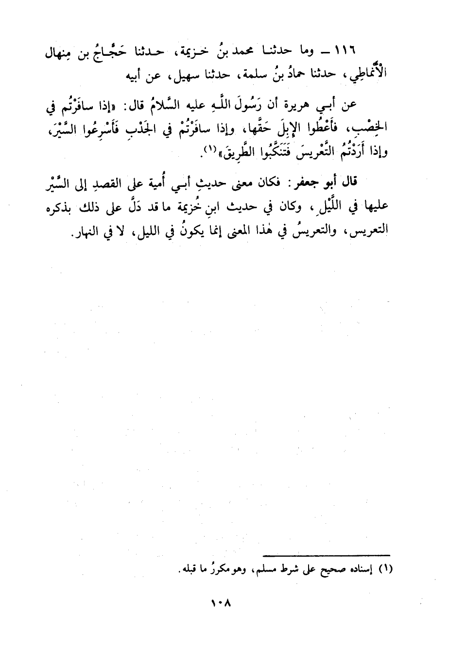 116 - وَمَا حَدَّثَنَا مُحَمَّدُ بْنُ خُزَيْمَةَ، حَدَّثَنَا حَجَّاجُ بْنُ مِنْهَالٍ الْأَنْمَاطِيُّ، حَدَّثَنَا حَمَّادُ بْنُ سَلَمَةَ، حَدَّثَنَا سُهَيْلٌ، عَنْ أَبِيهِ، عَنْ أَبِي هُرَيْرَةَ، أَنَّ رَسُولَ اللهِ عَلَيْهِ السَّلَامُ قَالَ: " إذَا سَافَرْتُمْ فِي الْخِصْبِ فَأَعْطُوا الْإِبِلَ حَقَّهَا وَإِذَا سَافَرْتُمْ فِي الْجَدْبِ فَأَسْرِعُوا السَّيْرَ وَإِذَا أَرَدْتُمُ التَّعْرِيسَ فَتَنَكَّبُوا الطَّرِيقَ " قَالَ أَبُو جَعْفَرٍ: فَكَانَ مَعْنَى حَدِيثِ أَبِي أُمَيَّةَ عَلَى الْقَصْدِ إلَى السَّيْرِ عَلَيْهَا فِي اللَّيْلِ وَكَانَ فِي حَدِيثِ ابْنِ خُزَيْمَةَ مَا قَدْ دَلَّ عَلَى ذَلِكَ بِذِكْرِهِ التَّعْرِيسَ , وَالتَّعْرِيسُ فِي هَذَا الْمَعْنَى إنَّمَا يَكُونُ فِي اللَّيْلِ لَا فِي النَّهَارِ