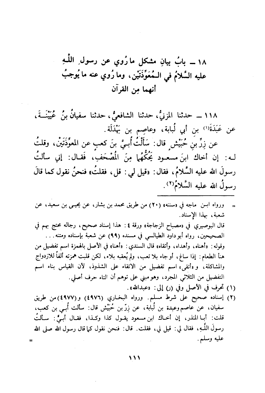 118 - حَدَّثَنَا الْمُزَنِيُّ، حَدَّثَنَا الشَّافِعِيُّ، حَدَّثَنَا سُفْيَانُ بْنُ عُيَيْنَةَ، عَنْ عَبْدَةَ بْنِ أَبِي لُبَابَةَ، وَعَاصِمِ بْنِ بَهْدَلَةَ، عَنْ زِرِّ بْنِ حُبَيْشٍ، قَالَ سَأَلْتُ أُبَيَّ بْنَ كَعْبٍ عَنِ الْمُعَوِّذَتَيْنِ، وَقُلْتُ لَهُ: إنَّ أَخَاكَ ابْنَ مَسْعُودٍ يَحُكُّهُمَا مِنَ الْمُصْحَفِ فَقَالَ: إنِّي سَأَلْتُ رَسُولَ اللهِ عَلَيْهِ السَّلَامُ فَقَالَ: " قِيلَ لِي: قُلْ فَقُلْتُ "، فَنَحْنُ نَقُولُ كَمَا قَالَ رَسُولُ اللهِ عَلَيْهِ السَّلَامُ -[112]-