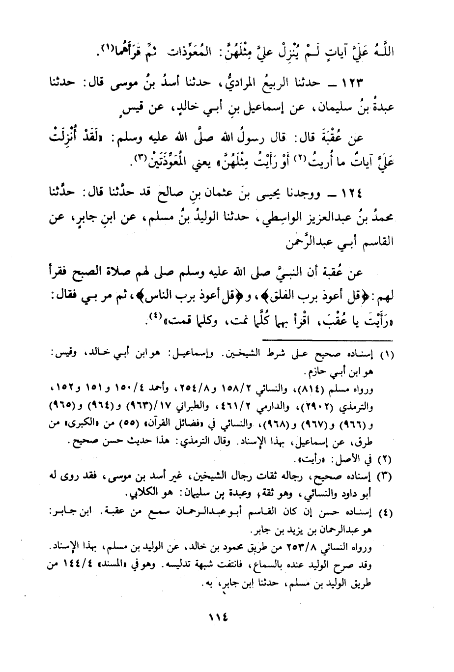 123 - حَدَّثَنَا الرَّبِيعُ الْمُرَادِيُّ، حَدَّثَنَا أَسَدُ بْنُ مُوسَى، قَالَ حَدَّثَنَا عَبْدَةُ بْنُ سُلَيْمَانَ، عَنْ إسْمَاعِيلَ بْنِ أَبِي خَالِدٍ، عَنْ قَيْسٍ، عَنْ عُقْبَةَ، قَالَ: قَالَ رَسُولُ اللهِ صَلَّى اللَّهُ عَلَيْهِ وَسَلَّمَ " لَقَدْ أُنْزِلَتْ عَلَيَّ آيَاتٌ مَا أُرِيتُ أَوْ رَأَيْتُ مِثْلَهُنَّ يَعْنِي الْمُعَوِّذَتَيْنِ "