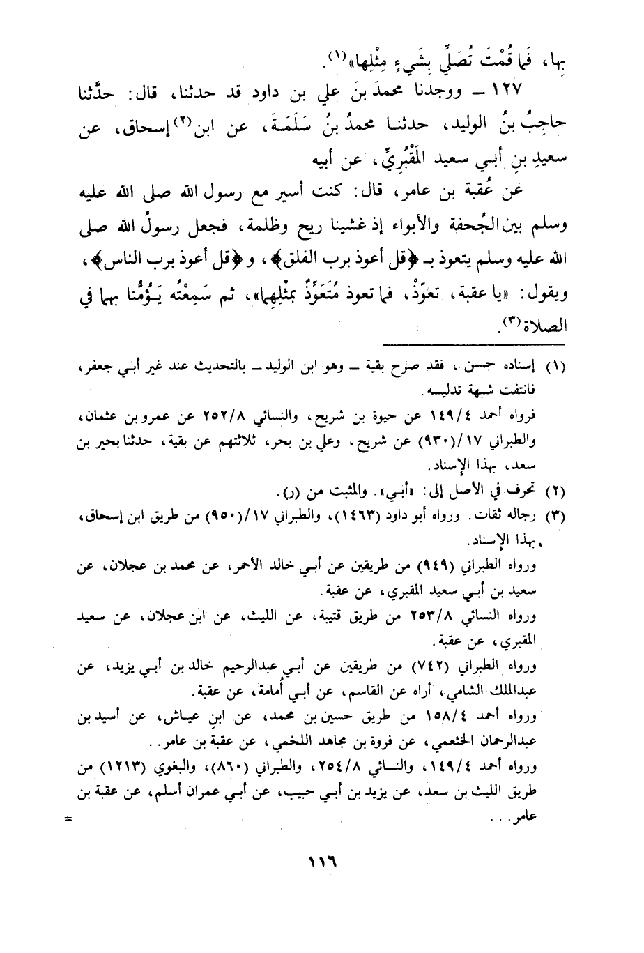 127 - وَوَجَدْنَا مُحَمَّدَ بْنَ عَلِيِّ بْنِ دَاوُدَ قَدْ حَدَّثَنَا قَالَ: حَدَّثَنَا حَاجِبُ بْنُ الْوَلِيدِ، حَدَّثَنَا مُحَمَّدُ بْنُ سَلَمَةَ، عَنِ ابْنِ إِسْحَاقَ، عَنْ سَعِيدِ بْنِ أَبِي سَعِيدٍ الْمَقْبُرِيِّ، عَنْ أَبِيهِ، عَنْ عُقْبَةَ بْنِ عَامِرٍ، قَالَ: كُنْتُ أَسِيرُ مَعَ رَسُولِ اللهِ صَلَّى اللَّهُ عَلَيْهِ وَسَلَّمَ بَيْنَ الْجُحْفَةِ وَالْأَبْوَاءِ إذْ غَشِيَنَا رِيحٌ وَظُلْمَةٌ فَجَعَلَ رَسُولُ اللهِ صَلَّى اللَّهُ عَلَيْهِ وَسَلَّمَ يَتَعَوَّذُ بِ قُلْ أَعُوذُ بِرَبِّ الْفَلَقِ، وَقُلْ أَعُوذُ بِرَبِّ النَّاسِ وَيَقُولُ: " يَا عُقْبَةُ تَعَوَّذْ فَمَا تَعَوَّذَ مُتَعَوِّذٌ بِمِثْلِهِمَا " ثُمَّ سَمِعْتُهُ يَؤُمُّنَا بِهِمَا فِي الصَّلَاةِ