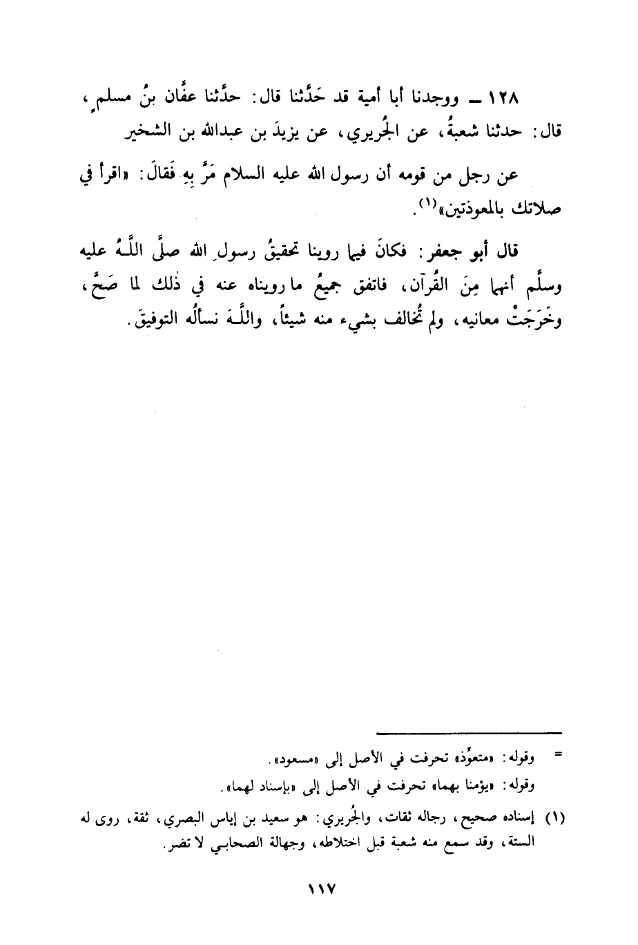 128 - وَوَجَدْنَا أَبَا أُمَيَّةَ قَدْ حَدَّثَنَا , قَالَ: حَدَّثَنَا عَفَّانَ بْنُ مُسْلِمٍ، قَالَ: حَدَّثَنَا شُعْبَةُ، عَنِ الْجَرِيرِيِّ، عَنْ يَزِيدَ بْنِ عَبْدِ اللهِ بْنِ الشِّخِّيرِ، عَنْ رَجُلٍ مِنْ قَوْمِهِ أَنَّ رَسُولَ اللهِ عَلَيْهِ السَّلَامُ مَرَّ بِهِ، فَقَالَ: " اقْرَأْ فِي صَلَاتِكَ بِالْمُعَوِّذَتَيْنِ " قَالَ أَبُو جَعْفَرٍ: فَكَانَ فِيمَا رَوَيْنَا تَحْقِيقُ رَسُولِ اللهِ صَلَّى اللَّهُ عَلَيْهِ وَسَلَّمَ أَنَّهُمَا مِنَ الْقُرْآنِ فَاتَّفَقَ جَمِيعُ مَا رَوَيْنَاهُ عَنْهُ فِي ذَلِكَ لَمَّا صَحَّ وَخَرَجَتْ مَعَانِيهِ وَلَمْ تُخَالِفْ بِشَيْءٍ مِنْهُ شَيْئًا وَاللهَ نَسْأَلُهُ التَّوْفِيقَ