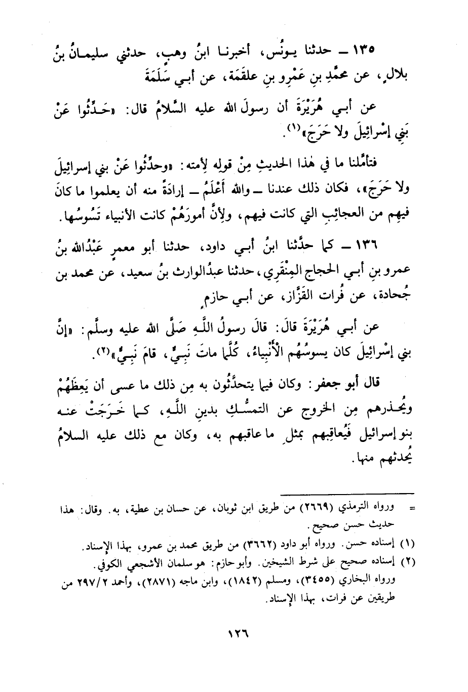 135 - حَدَّثَنَا يُونُسُ، أَخْبَرَنَا ابْنُ وَهْبٍ، حَدَّثَنِي سُلَيْمَانُ بْنُ بِلَالٍ، عَنْ مُحَمَّدِ بْنِ عَمْرِو بْنِ عَلْقَمَةَ، عَنْ أَبِي سَلَمَةَ، عَنْ أَبِي هُرَيْرَةَ، أَنَّ رَسُولَ اللهِ عَلَيْهِ السَّلَامُ قَالَ: " حَدِّثُوا عَنْ بَنِي إسْرَائِيلَ وَلَا حَرَجَ " فَتَأَمَّلْنَا مَا فِي هَذَا الْحَدِيثِ مِنْ قَوْلِهِ لِأُمَّتِهِ: " وَحَدِّثُوا عَنْ بَنِي إسْرَائِيلَ وَلَا حَرَجَ " فَكَانَ ذَلِكَ عِنْدَنَا وَاللهُ أَعْلَمُ إرَادَةً مِنْهُ أَنْ يَعْلَمُوا مَا كَانَ فِيهِمْ مِنَ الْعَجَائِبِ الَّتِي كَانَتْ فِيهِمْ ; وَلِأَنَّ أُمُورَهُمْ كَانَتِ الْأَنْبِيَاءُ تَسُوسُهَا