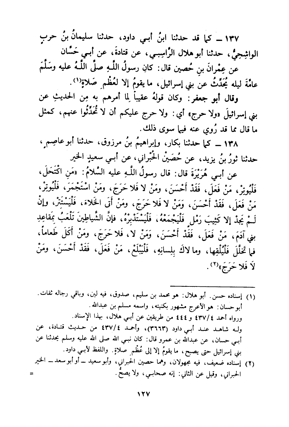 137 - كَمَا قَدْ حَدَّثَنَا ابْنُ أَبِي دَاوُدَ، حَدَّثَنَا سُلَيْمَانُ بْنُ حَرْبٍ الْوَاشِحِيُّ، حَدَّثَنَا أَبُو هِلَالٍ الرَّاسِبِيُّ، عَنْ قَتَادَةَ، عَنْ أَبِي حَسَّانَ، عَنْ عِمْرَانَ بْنِ حُصَيْنٍ، قَالَ: " كَانَ رَسُولُ اللهِ صَلَّى اللَّهُ عَلَيْهِ وَسَلَّمَ عَامَّةَ لَيْلِهِ يُحَدِّثُ عَنْ بَنِي إسْرَائِيلَ مَا يَقُومُ إلَّا لِعُظْمِ صَلَاةٍ ". وَقَالَ أَبُو جَعْفَرٍ: وَكَانَ قَوْلُهُ عَقِيبًا لِمَا أَمَرَهُمْ بِهِ مِنَ الْحَدِيثِ عَنْ بَنِي إسْرَائِيلَ " وَلَا حَرَجَ " أَيْ: وَلَا حَرَجَ عَلَيْكُمْ أَنْ لَا تُحَدِّثُوا عَنْهُمْ كَمِثْلِ مَا قَالَ مِمَّا قَدْ رُوِيَ عَنْهُ فِيمَا سِوَى ذَلِكَ