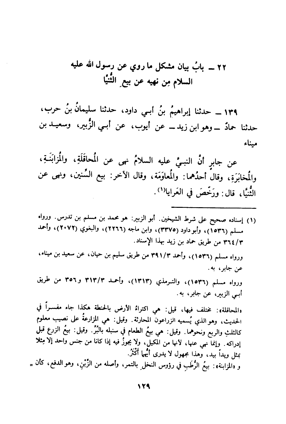 139 - حَدَّثَنَا إبْرَاهِيمُ بْنُ أَبِي دَاوُدَ، حَدَّثَنَا سُلَيْمَانُ بْنُ حَرْبٍ، حَدَّثَنَا حَمَّادٌ وَهُوَ ابْنُ زَيْدٍ , عَنْ أَيُّوبَ، عَنْ أَبِي الزُّبَيْرِ، وَسَعِيدِ بْنِ مِينَاءَ، عَنْ جَابِرٍ " أَنَّ النَّبِيَّ عَلَيْهِ السَّلَامُ: نَهَى عَنِ الْمُحَاقَلَةِ، وَالْمُزَابَنَةِ، وَالْمُخَابَرَةِ " وَقَالَ أَحَدُهُمَا: " وَالْمُعَاوَمَةِ " وَقَالَ الْآخَرُ: " بَيْعُ السِّنِينَ " , " وَنَهَى عَنِ الثُّنْيَا " قَالَ: " وَرَخَّصَ فِي الْعَرَايَا "