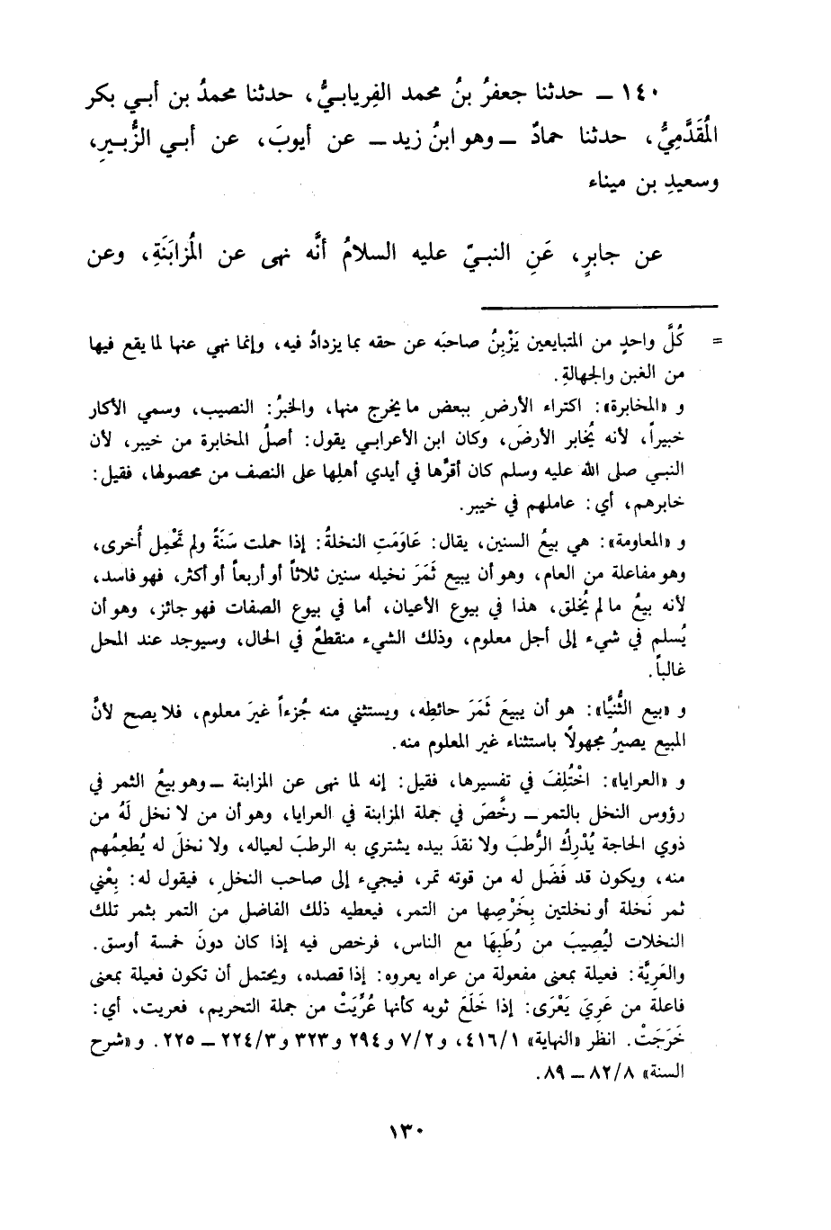 140 - حَدَّثَنَا جَعْفَرُ بْنُ مُحَمَّدٍ الْفِرْيَابِيُّ، حَدَّثَنَا مُحَمَّدُ بْنُ أَبِي بَكْرٍ الْمُقَدَّمِيُّ، حَدَّثَنَا حَمَّادُ وَهُوَ ابْنُ زَيْدٍ، عَنْ أَيُّوبَ، عَنْ أَبِي الزُّبَيْرِ، وَسَعِيدِ بْنِ مِينَاءَ، عَنْ جَابِرٍ، عَنِ النَّبِيِّ عَلَيْهِ السَّلَامُ أَنَّهُ: " نَهَى عَنِ الْمُزَابَنَةِ، وَعَنِ -[131]- الْمُحَاقَلَةِ، وَالْمُعَاوَمَةِ، وَالْمُخَابَرَةِ " قَالَ أَحَدُهُمَا: " وَعَنْ بَيْعِ السِّنِينَ، وَعَنِ الثُّنْيَا، وَرَخَّصَ، فِي بَيْعِ الْعَرَايَا " فَكَانَ ظَاهِرُ الْحَدِيثِ النَّهْيَ عَنْ بَيْعِ الثُّنْيَا مُطْلَقًا وَكَانَ فِي ذَلِكَ إنْ لَمْ يَكُنْ حَقِيقَةً بِخِلَافِ ظَاهِرِهِ الْمَنْعُ مِنَ الْبَيْعِ الَّذِي يَكُونُ فِيهِ الثُّنْيَا فَتَأَمَّلْنَا ذَلِكَ مَا رُوِيَ عَنْ رَسُولِ اللهِ عَلَيْهِ السَّلَامُ فِي هَذَا الْمَعْنَى سِوَى هَذَا الْحَدِيثِ هَلْ نَجِدُ فِيهِ مَا يَدُلُّ عَلَى إيضَاحِ حَقِيقَةِ مُرَادِهِ فِي ذَلِكَ