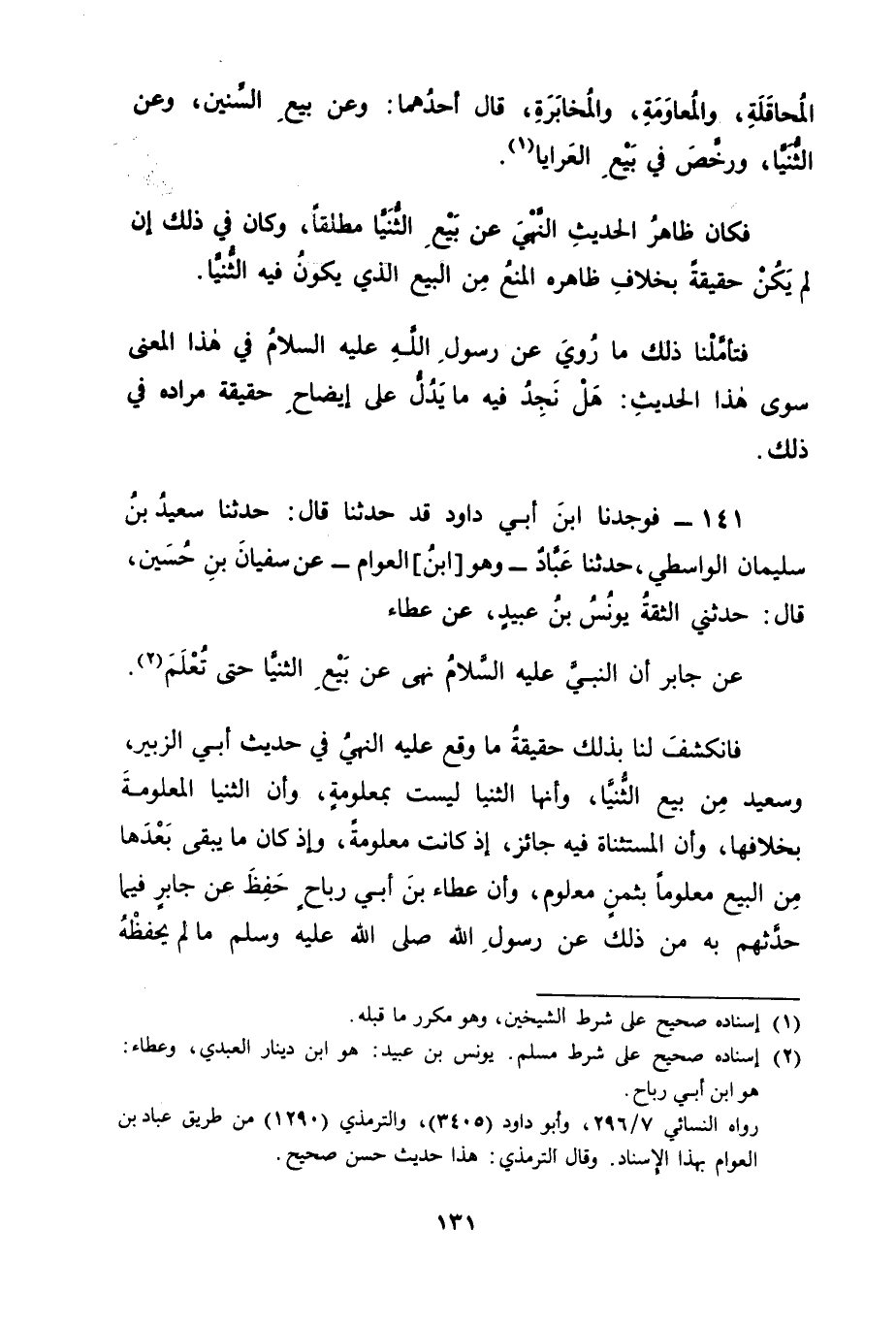 141 - فَوَجَدْنَا ابْنَ أَبِي دَاوُدَ قَدْ حَدَّثَنَا قَالَ: حَدَّثَنَا سَعِيدُ بْنُ سُلَيْمَانَ الْوَاسِطِيُّ، حَدَّثَنَا عَبَّادٌ وَهُوَ ابْنُ الْعَوَّامِ، عَنْ سُفْيَانَ بْنِ حُسَيْنٍ، قَالَ: حَدَّثَنِي الثِّقَةُ يُونُسُ بْنُ عُبَيْدٍ، عَنْ عَطَاءٍ، عَنْ جَابِرٍ، أَنَّ النَّبِيَّ عَلَيْهِ السَّلَامُ: " نَهَى عَنْ بَيْعِ الثُّنْيَا حَتَّى تُعْلَمَ " فَانْكَشَفَ لَنَا بِذَلِكَ حَقِيقَةُ مَا وَقَعَ عَلَيْهِ النَّهْيُ فِي حَدِيثِ أَبِي الزُّبَيْرِ وَسَعِيدٍ مِنْ بَيْعِ الثُّنْيَا , وَأَنَّهَا الثُّنْيَا لَيْسَتْ بِمَعْلُومَةٍ وَأَنَّ الثُّنْيَا الْمَعْلُومَةَ بِخِلَافِهَا، وَأَنَّ الْمُسْتَثْنَاةَ فِيهِ جَائِزٌ إذْ كَانَتْ مَعْلُومَةً، وَإِذْ كَانَ مَا يَبْقَى بَعْدَهَا مِنَ الْبَيْعِ مَعْلُومًا بِثَمَنٍ مَعْلُومٍ، وَأَنَّ عَطَاءَ بْنَ أَبِي رَبَاحٍ حَفِظَ عَنْ جَابِرٍ فِيمَا حَدَّثَهُمْ بِهِ مِنْ ذَلِكَ عَنْ رَسُولِ اللهِ صَلَّى اللَّهُ عَلَيْهِ وَسَلَّمَ مَا لَمْ يَحْفَظْهُ -[132]- أَبُو الزُّبَيْرِ وَلَا سَعِيدٌ فَكَانَ بِذَلِكَ مَا رَوَى فِيهِ عَنْ جَابِرٍ أَوْلَى مِمَّا رَوَيَاهُ فِيهِ عَنْهُ. وَقَدِ اخْتَلَفَ أَهْلُ الْعِلْمِ فِي الْبَيْعِ إذَا كَانَتْ جُزْءًا مِنْ أَجْزَاءِ مَبِيعٍ. فَكَانَ مَالِكُ بْنُ أَنَسٍ يَقُولُ فِي ذَلِكَ مَا