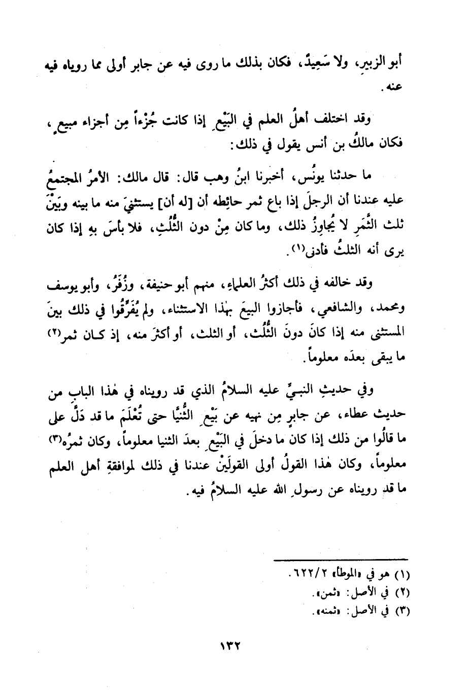 حَدَّثَنَا يُونُسُ , أَخْبَرَنَا ابْنُ وَهْبٍ قَالَ: قَالَ مَالِكٌ: " الْأَمْرُ الْمُجْتَمَعُ عَلَيْهِ عِنْدَنَا أَنَّ الرَّجُلَ إذَا بَاعَ ثَمَرَ حَائِطِهِ أَنَّ لَهُ أَنْ يَسْتَثْنِيَ مِنْهُ مَا بَيْنَهُ وَبَيْنَ ثُلُثِ الثَّمَرِ لَا يُجَاوِزُ ذَلِكَ وَمَا كَانَ مِنْ دُونِ الثُّلُثِ فَلَا بَأْسَ بِهِ إذَا كَانَ يَرَى أَنَّهُ الثُّلُثُ فَأَدْنَى " وَقَدْ خَالَفَهُ فِي ذَلِكَ أَكْثَرُ الْعُلَمَاءِ مِنْهُمْ أَبُو حَنِيفَةَ، وَزُفَرُ، وَأَبُو يُوسُفَ، وَمُحَمَّدٌ وَالشَّافِعِيُّ فَأَجَازُوا الْبَيْعَ بِهَذَا الِاسْتِثْنَاءِ وَلَمْ يُفَرِّقُوا فِي ذَلِكَ بَيْنَ الْمُسْتَثْنَى مِنْهُ إذَا كَانَ دُونَ الثُّلُثِ أَوِ الثُّلُثَ أَوْ أَكْثَرَ مِنْهُ إذْ كَانَ ثَمَرٌ مَا يَبْقَى بَعْدَهُ مَعْلُومًا. وَفِي حَدِيثِ النَّبِيِّ عَلَيْهِ السَّلَامُ الَّذِي قَدْ رَوَيْنَاهُ فِي هَذَا الْبَابِ مِنْ حَدِيثِ عَطَاءٍ عَنْ جَابِرٍ مِنْ نَهْيِهِ عَنْ بَيْعِ الثُّنْيَا حَتَّى تُعْلَمَ مَا قَدْ دَلَّ عَلَى مَا قَالُوا مِنْ ذَلِكَ إذَا كَانَ مَا دَخَلَ فِي الْبَيْعِ بَعْدَ الثُّنْيَا مَعْلُومًا وَكَانَ ثَمَرُهُ مَعْلُومًا وَكَانَ هَذَا الْقَوْلُ أَوْلَى الْقَوْلَيْنِ عِنْدَنَا فِي ذَلِكَ لِمُوَافَقَةِ أَهْلِ الْعِلْمِ مَا قَدْ رَوَيْنَاهُ عَنْ رَسُولِ اللهِ عَلَيْهِ السَّلَامُ فِيهِ