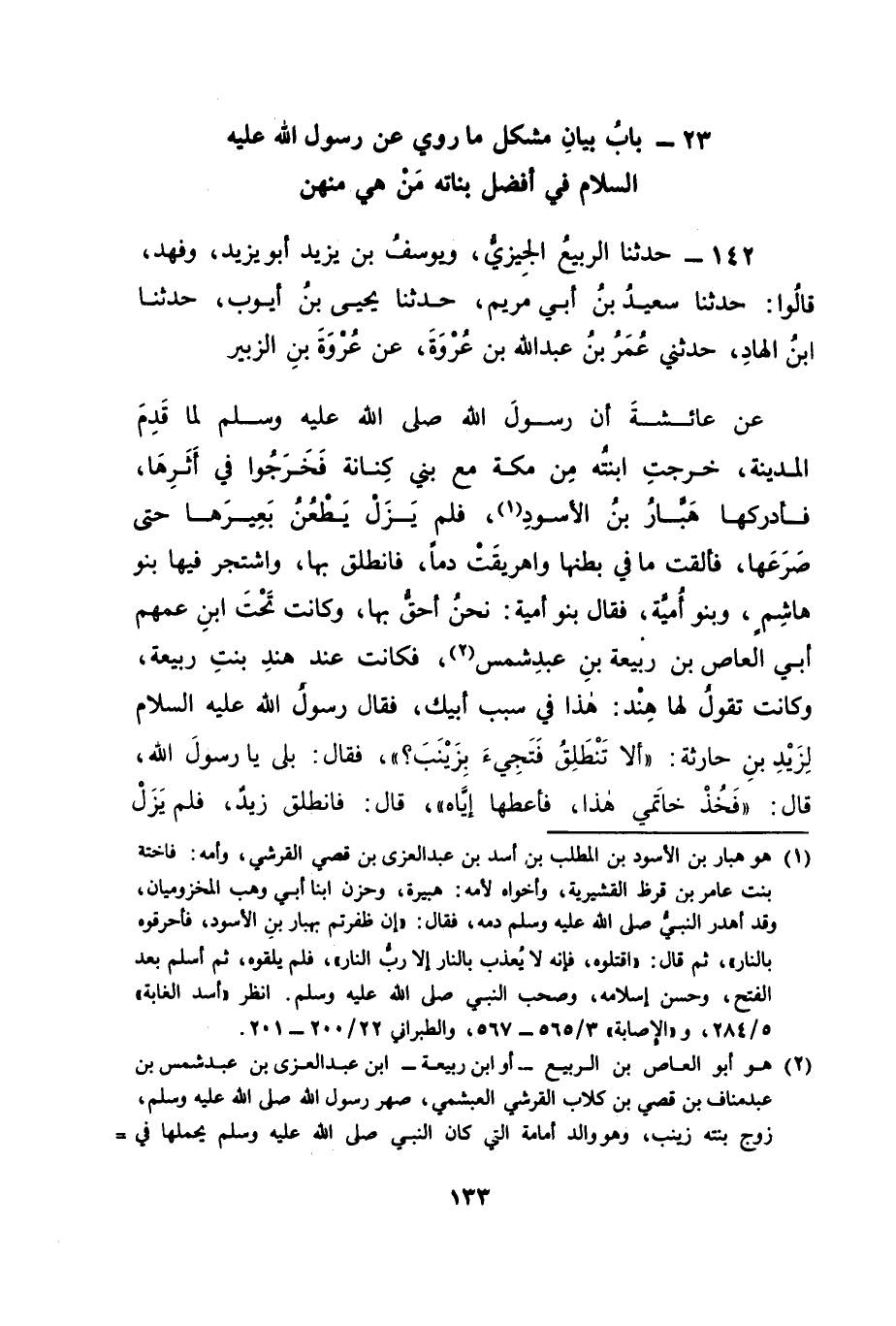 142 - حَدَّثَنَا الرَّبِيعُ الْجِيزِيُّ، وَيُوسُفُ بْنُ يَزِيدَ أَبُو يَزِيدَ، وَفَهْدٌ، قَالُوا: حَدَّثَنَا سَعِيدُ بْنُ أَبِي مَرْيَمَ، حَدَّثَنَا يَحْيَى بْنُ أَيُّوبَ، حَدَّثَنَا ابْنُ الْهَادِ، حَدَّثَنِي عُمَرُ بْنُ عَبْدِ اللهِ بْنِ عُرْوَةَ، عَنْ عُرْوَةَ بْنِ الزُّبَيْرِ، عَنْ عَائِشَةَ، أَنَّ رَسُولَ اللهِ صَلَّى اللَّهُ عَلَيْهِ وَسَلَّمَ لَمَّا قَدِمَ الْمَدِينَةَ خَرَجَتِ ابْنَتُهُ مِنْ مَكَّةَ مَعَ بَنِي كِنَانَةَ فَخَرَجُوا فِي أَثَرِهَا فَأَدْرَكَهَا هَبَّارُ بْنُ الْأَسْوَدِ فَلَمْ يَزَلْ يَطْعَنُ بَعِيرَهَا حَتَّى صَرَعَهَا فَأَلْقَتْ مَا فِي بَطْنِهَا وَأُهْرِيقَتْ دَمًا فَانْطَلَقَ بِهَا وَاشْتَجَرَ فِيهَا بَنُو هَاشِمٍ، وَبَنُو أُمَيَّةَ فَقَالَ: بَنُو أُمَيَّةَ نَحْنُ أَحَقُّ بِهَا وَكَانَتْ تَحْتَ ابْنِ عَمِّهِمْ أَبِي الْعَاصِ بْنِ رَبِيعَةَ بْنِ عَبْدِ شَمْسٍ فَكَانَتْ عِنْدَ هِنْدَ بِنْتِ رَبِيعَةَ وَكَانَتْ تَقُولُ لَهَا هِنْدٌ: هَذَا فِي سَبَبِ أَبِيكِ، فَقَالَ رَسُولُ اللهِ عَلَيْهِ السَّلَامُ لِزَيْدِ بْنِ حَارِثَةَ: " أَلَا تَنْطَلِقُ فَتَجِيءُ بِزَيْنَبَ "؟، فَقَالَ: بَلَى يَا رَسُولَ اللهِ قَالَ: " فَخُذْ خَاتَمِي هَذَا فَأَعْطِهَا إيَّاهُ " قَالَ: فَانْطَلَقَ زَيْدٌ فَلَمْ يَزَلْ -[134]- يَلْطُفُ وَتَرَكَ بَعِيرَهُ حَتَّى أَتَى رَاعِيًا فَقَالَ: لِمَنْ تَرْعَى؟ فَقَالَ: لِأَبِي الْعَاصِ بْنِ رَبِيعَةَ قَالَ: فَلِمَنْ هَذِهِ الْغَنَمُ؟ قَالَ: لِزَيْنَبَ بِنْتِ مُحَمَّدٍ عَلَيْهِ السَّلَامُ فَسَارَ مَعَهُ شَيْئًا , ثُمَّ قَالَ لَهُ: هَلْ لَكَ أَنْ أُعْطِيَكَ شَيْئًا تُعْطِيهَا إيَّاهُ، وَلَا تَذْكُرَهُ لِأَحَدٍ؟ قَالَ: نَعَمْ. فَأَعْطَاهُ الْخَاتَمَ فَانْطَلَقَ الرَّاعِي فَأَدْخَلَ غَنَمَهُ وَأَعْطَاهَا الْخَاتَمَ فَعَرَفَتْهُ فَقَالَتْ: مَنْ أَعْطَاكَ هَذَا؟ قَالَ رَجُلٌ قَالَتْ: وَأَيْنَ تَرَكْتَهُ؟ قَالَ: مَكَانَ كَذَا , وَكَذَا فَسَكَنَتْ حَتَّى إذَا كَانَ اللَّيْلُ خَرَجَتْ إلَيْهِ فَقَالَ لَهَا: ارْكَبِي بَيْنَ يَدَيَّ قَالَتْ: لَا , وَلَكِنِ ارْكَبْ أَنْتَ فَرَكِبَ، وَرَكِبَتْ وَرَاءَهُ حَتَّى أَتَتِ النَّبِيَّ عَلَيْهِ السَّلَامُ فَكَانَ رَسُولُ اللهِ عَلَيْهِ السَّلَامُ يَقُولُ: " هِيَ أَفْضَلُ بَنَاتِي أُصِيبَتْ فِيَّ ". فَبَلَغَ ذَلِكَ عَلِيَّ بْنَ حُسَيْنِ بْنِ عَلِيٍّ فَانْطَلَقَ إلَى عُرْوَةَ بْنِ الزُّبَيْرِ فَقَالَ: مَا حَدِيثٌ بَلَغَنِي عَنْكَ أَنَّكَ تُحَدِّثُهُ تَنْتَقِصُ فِيهِ حَقَّ فَاطِمَةَ فَقَالَ عُرْوَةُ: مَا أُحِبُّ أَنَّ لِي مَا بَيْنَ الْمَشْرِقِ وَالْمَغْرِبِ وَإِنِّي أَنْتَقِصُ فَاطِمَةَ حَقًّا هُوَ لَهَا وَأَمَّا بَعْدُ فَلَكَ عَلَيَّ أَنْ لَا أُحَدِّثَ بِهِ أَبَدًا قَالَ أَبُو جَعْفَرٍ: فَكَانَ فِي هَذَا الْحَدِيثِ مِمَّا يَجِبُ تَأَمُّلُهُ وَالْوُقُوفُ -[135]- عَلَى الْمَعْنَى فِيهِ مِنْ قَوْلِ رَسُولِ اللهِ عَلَيْهِ السَّلَامُ: لِزَيْدِ بْنِ حَارِثَةَ " أَلَا تَنْطَلِقُ فَتَجِيءُ بِزَيْنَبَ " وَزَيْدٌ لَيْسَ بِمَحْرَمٍ مِنْهَا، وَلَا بِزَوْجٍ لَهَا , وَقَدْ نَهَى صَلَّى اللَّهُ عَلَيْهِ وَسَلَّمَ أَنْ تُسَافِرَ امْرَأَةٌ إلَّا مَعَ ذِي مَحْرَمٍ وَرُوِيَتْ عَنْهُ فِي ذَلِكَ آثَارٌ بَعْضُهَا مُطْلَقٌ بِلَا ذِكْرِ وَقْتٍ مَعْلُومٍ لِذَلِكَ السَّفَرِ وَبَعْضُهَا فِيهِ ذِكْرُ مِقْدَارِ ذَلِكَ السَّفَرِ مِنَ الزَّمَانِ وَفِي بَعْضِهَا إلَّا وَمَعَهَا زَوْجٌ أَوْ ذُو مَحْرَمٍ مِنْهَا. وَسَنَذْكُرُ هَذَا الْبَابَ وَمَا رُوِيَ عَنْ رَسُولِ اللهِ صَلَّى اللَّهُ عَلَيْهِ وَسَلَّمَ فِيهِ فِيمَا بَعْدُ مِنْ كِتَابِنَا هَذَا إنْ شَاءَ اللهُ. غَيْرَ أَنَّا تَأَمَّلْنَا مَا كَانَ مِنْ رَسُولِ اللهِ عَلَيْهِ السَّلَامُ فِي هَذ