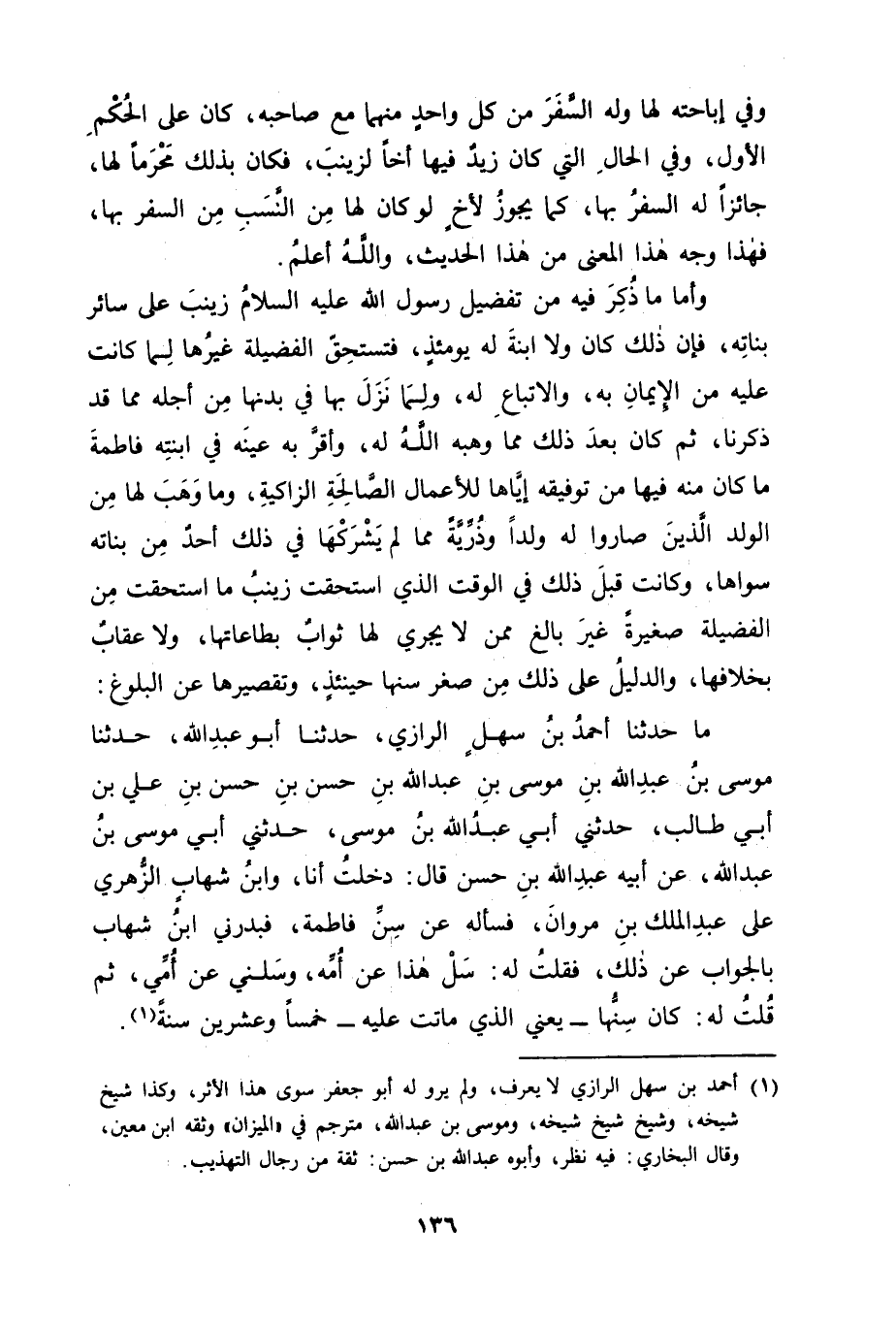 مَا حَدَّثَنَا أَحْمَدُ بْنُ سَهْلٍ الرَّازِيُّ , حَدَّثَنَا أَبُو عَبْدِ اللهِ , حَدَّثَنَا مُوسَى بْنُ عَبْدِ اللهِ بْنِ مُوسَى بْنِ عَبْدِ اللهِ بْنِ حَسَنِ بْنِ حَسَنِ بْنِ عَلِيِّ بْنِ أَبِي طَالِبٍ , حَدَّثَنِي أَبِي عَبْدُ اللهِ بْنُ مُوسَى , حَدَّثَنِي أَبِي مُوسَى بْنُ عَبْدِ اللهِ , عَنْ أَبِيهِ عَبْدِ اللهِ بْنِ حَسَنِ قَالَ: دَخَلْتُ أَنَا وَابْنُ شِهَابٍ الزُّهْرِيُّ عَلَى عَبْدِ الْمَلِكِ بْنِ مَرْوَانَ فَسَأَلَهُ عَنْ سِنِّ فَاطِمَةَ فَبَدَرَنِي ابْنُ شِهَابٍ بِالْجَوَابِ عَنْ ذَلِكَ فَقُلْتُ لَهُ: " سَلْ هَذَا عَنْ أُمِّهِ وَسَلْنِي عَنْ أُمِّي " ثُمَّ قُلْتُ لَهُ: " كَانَ سِنُّهَا، يَعْنِي الَّذِي مَاتَتْ عَلَيْهِ، خَمْسًا وَعِشْرِينَ سَنَةً " -[137]- ثُمَّ تَأَمَّلْنَا الْوَقْتَ الَّذِي كَانَتْ فِيهِ وَفَاتُهَا أَيَّ وَقْتٍ كَانَ مِنَ الزَّمَانِ
