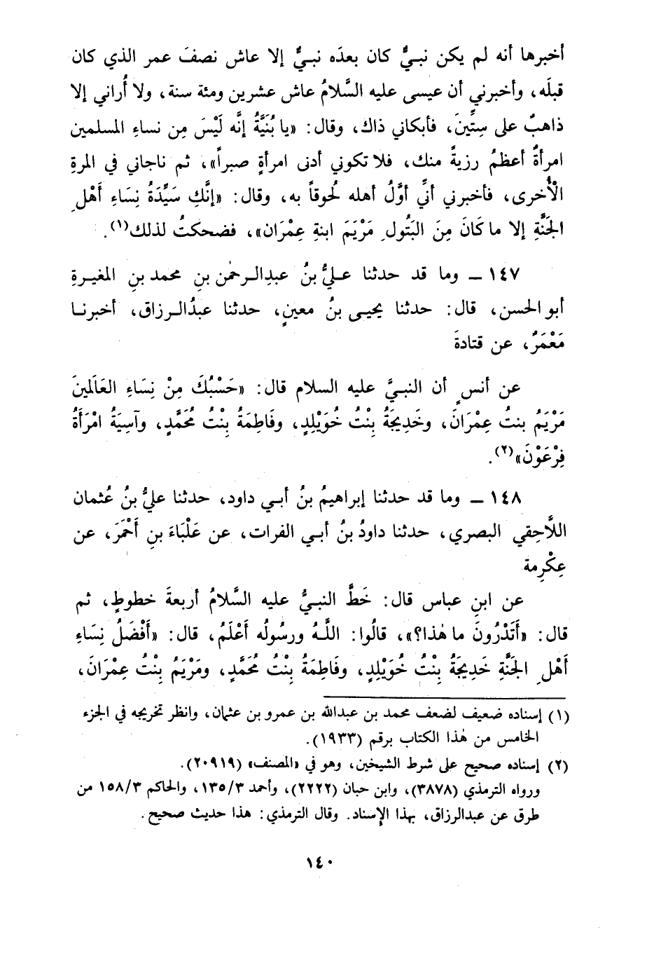 147 - وَمَا قَدْ حَدَّثَنَا عَلِيُّ بْنُ عَبْدِ الرَّحْمَنِ بْنِ مُحَمَّدِ بْنِ الْمُغِيرَةِ أَبُو الْحَسَنِ، قَالَ حَدَّثَنَا يَحْيَى بْنُ مَعِينٍ، حَدَّثَنَا عَبْدُ الرَّزَّاقِ، أَخْبَرَنَا مَعْمَرٌ، عَنْ قَتَادَةَ، عَنْ أَنَسٍ، أَنَّ النَّبِيَّ عَلَيْهِ السَّلَامُ قَالَ: " حَسْبُكَ مِنْ نِسَاءِ الْعَالَمِينَ مَرْيَمُ بِنْتُ عِمْرَانَ وَخَدِيجَةُ بِنْتُ خُوَيْلِدٍ وَفَاطِمَةُ بِنْتُ مُحَمَّدٍ وَآسِيَةُ امْرَأَةُ فِرْعَوْنَ "