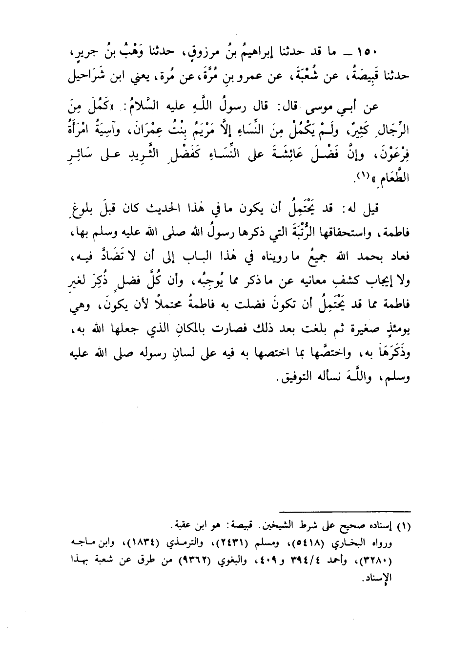 150 - مَا قَدْ حَدَّثَنَا إبْرَاهِيمُ بْنُ مَرْزُوقٍ، حَدَّثَنَا وَهْبُ بْنُ جَرِيرٍ، حَدَّثَنَا قَبِيصَةُ، عَنْ شُعْبَةَ، عَنْ عَمْرِو بْنِ مُرَّةَ، عَنْ مُرَّةَ يَعْنِي ابْنَ شَرَاحِيلَ، عَنْ أَبِي مُوسَى، قَالَ: قَالَ رَسُولُ اللهِ عَلَيْهِ السَّلَامُ: " كَمُلَ مِنَ الرِّجَالِ كَثِيرٌ، وَلَمْ يَكْمُلْ مِنَ النِّسَاءِ إلَّا مَرْيَمُ بِنْتُ عِمْرَانَ، وَآسِيَةُ امْرَأَةُ فِرْعَوْنَ وَإِنَّ فَضْلَ عَائِشَةَ عَلَى النِّسَاءِ كَفَضْلِ الثَّرِيدِ عَلَى سَائِرِ الطَّعَامِ " قِيلَ لَهُ: قَدْ يَحْتَمِلُ أَنْ يَكُونَ مَا فِي هَذَا الْحَدِيثِ كَانَ قَبْلَ بُلُوغِ فَاطِمَةَ وَاسْتِحْقَاقِهَا الرُّتْبَةَ الَّتِي ذَكَرَهَا رَسُولُ اللهِ صَلَّى اللَّهُ عَلَيْهِ وَسَلَّمَ بِهَا فَعَادَ بِحَمْدِ اللهِ جَمِيعُ مَا رَوَيْنَاهُ فِي هَذَا الْبَابِ إلَى أَنْ لَا تَضَادَّ فِيهِ، وَلَا إيجَابَ كَشْفِ مَعَانِيهِ عَنْ مَا ذُكِرَ مِمَّا يُوجِبُهُ , وَأَنَّ كُلَّ فَضْلٍ ذُكِرَ لِغَيْرِ فَاطِمَةَ مِمَّا قَدْ يَحْتَمِلُ أَنْ تَكُونَ فَضُلَتْ بِهِ فَاطِمَةُ مُحْتَمِلًا لَأَنْ يَكُونَ وَهِيَ يَوْمَئِذٍ صَغِيرَةٌ , ثُمَّ بَلَغَتْ بَعْدَ ذَلِكَ فَصَارَتْ بِالْمَكَانِ الَّذِي جَعَلَهَا اللهُ بِهِ وَذَكَرَهَا بِهِ، وَاخْتَصَّهَا بِمَا اخْتَصَّهَا بِهِ فِيهِ عَلَى لِسَانِ رَسُولِهِ صَلَّى اللَّهُ عَلَيْهِ وَسَلَّمَ، وَاللهُ نَسْأَلُهُ التَّوْفِيقَ