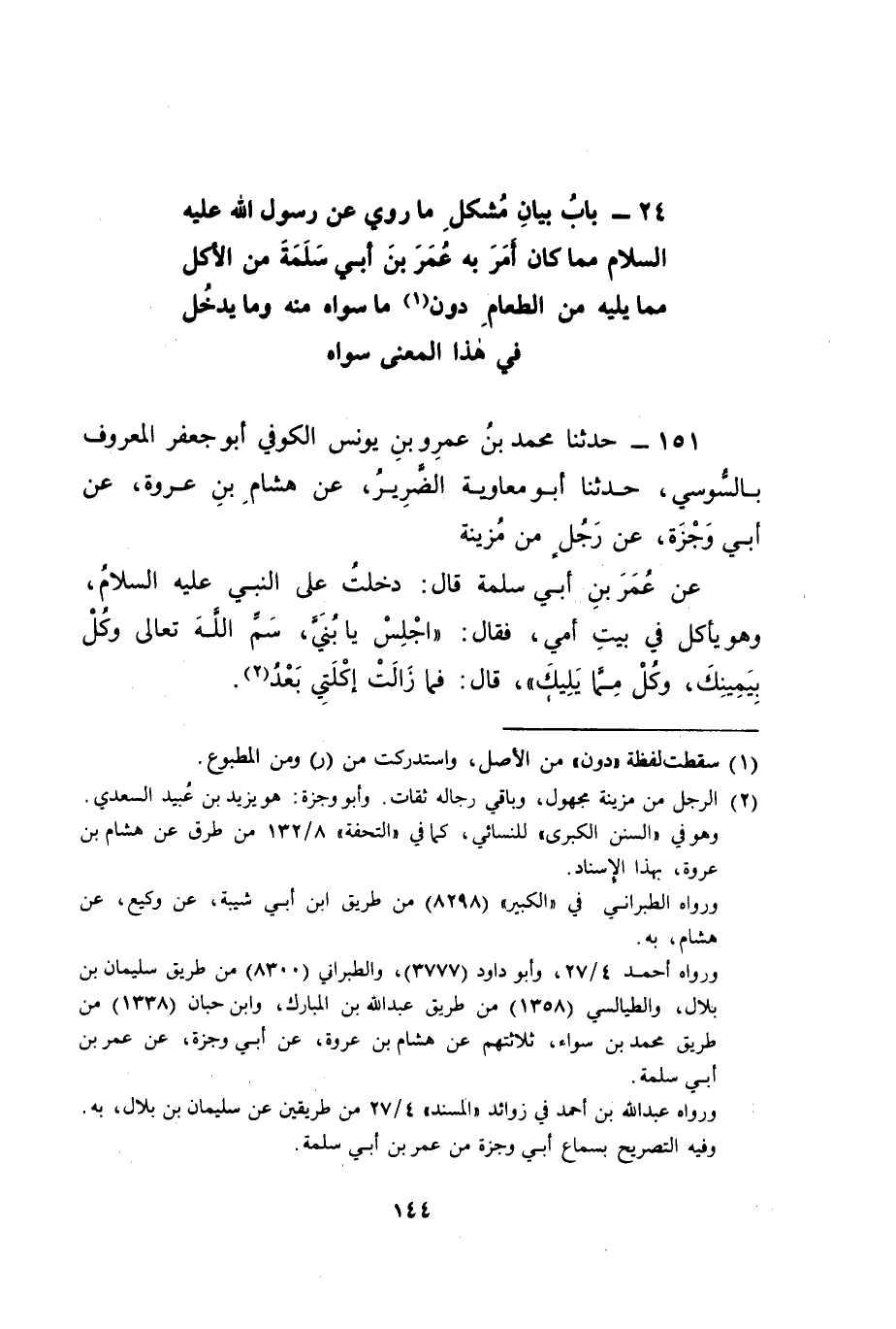 151 - حَدَّثَنَا مُحَمَّدُ بْنُ عَمْرِو بْنِ يُونُسَ الْكُوفِيُّ أَبُو جَعْفَرٍ الْمَعْرُوفُ بِالسُّوسِيِّ , حَدَّثَنَا أَبُو مُعَاوِيَةَ الضَّرِيرُ , عَنْ هِشَامِ بْنِ عُرْوَةَ، عَنْ أَبِي وَجْزَةَ، عَنْ رَجُلٍ مِنْ مُزَيْنَةَ , عَنْ عُمَرَ بْنِ أَبِي سَلَمَةَ، قَالَ: دَخَلْتُ عَلَى النَّبِيِّ عَلَيْهِ السَّلَامُ , وَهُوَ يَأْكُلُ فِي بَيْتِ أُمِّي فَقَالَ: " اجْلِسْ يَا بُنَيَّ سَمِّ اللهَ تَعَالَى وَكُلْ بِيَمِينِكَ وَكُلْ مِمَّا يَلِيكَ " قَالَ: فَمَا زَالَتْ إِكْلَتِي بَعْدُ -[145]-