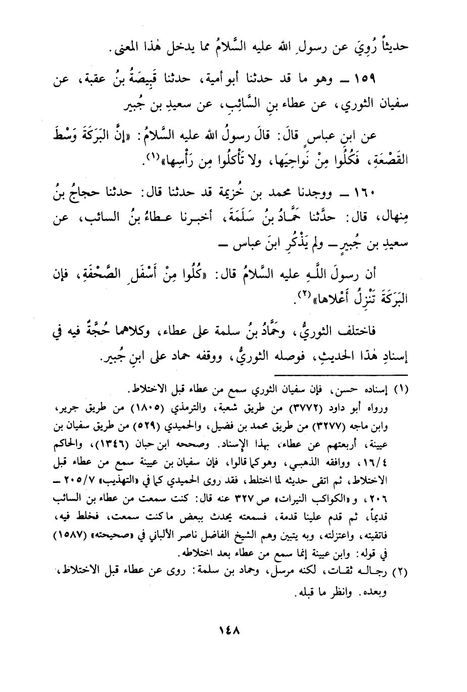 160 - وَوَجَدْنَا مُحَمَّدَ بْنَ خُزَيْمَةَ قَدْ حَدَّثَنَا قَالَ: حَدَّثَنَا حَجَّاجُ بْنُ مِنْهَالٍ، قَالَ: حَدَّثَنَا حَمَّادُ بْنُ سَلَمَةَ، أَخْبَرَنَا عَطَاءُ بْنُ السَّائِبِ، عَنْ سَعِيدِ بْنِ جُبَيْرٍ، وَلَمْ يَذْكُرِ ابْنَ عَبَّاسٍ، أَنَّ رَسُولَ اللهِ عَلَيْهِ السَّلَامُ قَالَ: " كُلُوا مِنْ أَسْفَلِ الصَّحْفَةِ فَإِنَّ الْبَرَكَةَ تَنْزِلُ أَعْلَاهَا " فَاخْتَلَفَ الثَّوْرِيُّ وَحَمَّادُ بْنُ سَلَمَةَ عَلَى عَطَاءٍ وَكِلَاهُمَا حُجَّةٌ فِيهِ فِي إسْنَادِ هَذَا الْحَدِيثِ فَوَصَلَهُ الثَّوْرِيُّ وَوَقَفَهُ حَمَّادٌ عَلَى ابْنِ جُبَيْرٍ