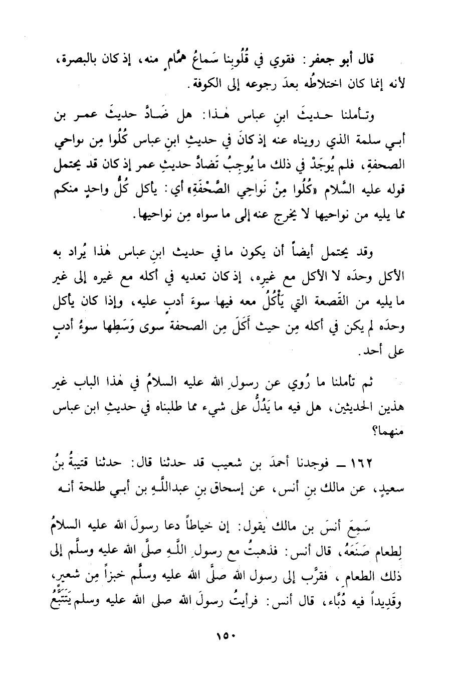162 - فَوَجَدْنَا أَحْمَدَ بْنَ شُعَيْبٍ قَدْ حَدَّثَنَا قَالَ: حَدَّثَنَا قُتَيْبَةُ بْنُ سَعِيدٍ، عَنْ مَالِكِ بْنِ أَنَسٍ، عَنْ إِسْحَاقَ بْنِ عَبْدِ اللهِ بْنِ أَبِي طَلْحَةَ، أَنَّهُ سَمِعَ أَنَسَ بْنَ مَالِكٍ، يَقُولُ: إنَّ خَيَّاطًا دَعَا رَسُولَ اللهِ عَلَيْهِ السَّلَامُ لِطَعَامٍ صَنَعَهُ قَالَ أَنَسٌ: فَذَهَبْتُ مَعَ رَسُولِ اللهِ صَلَّى اللَّهُ عَلَيْهِ وَسَلَّمَ إلَى ذَلِكَ الطَّعَامِ فَقَرَّبَ إلَى رَسُولِ اللهِ صَلَّى اللَّهُ عَلَيْهِ وَسَلَّمَ خُبْزًا مِنْ شَعِيرٍ وَقَدِيدًا فِيهِ دُبَّاءٌ قَالَ أَنَسٌ: " فَرَأَيْتُ رَسُولَ اللهِ صَلَّى اللَّهُ عَلَيْهِ وَسَلَّمَ يَتَتَبَّعُ -[151]- الدُّبَّاءَ مِنْ حَوْلِ الصَّحْفَةِ فَلَمْ أَزَلْ أُحِبُّ الدُّبَّاءَ مِنْ يَوْمِئِذٍ " فَكَانَ فِي هَذَا الْحَدِيثِ ذِكْرُ أَكْلِ رَسُولِ اللهِ صَلَّى اللَّهُ عَلَيْهِ وَسَلَّمَ مِنْ غَيْرِ مَا كَانَ يَلِيهِ مِنَ الْقَصْعَةِ الَّتِي كَانَ يَأْكُلُ فِيهَا ذَلِكَ الطَّعَامَ. فَعَقَلْنَا بِذَلِكَ أَنَّ مَا فِي حَدِيثِ عُمَرَ بْنِ أَبِي سَلَمَةَ مِمَّا نَهَاهُ رَسُولُ اللهِ صَلَّى اللَّهُ عَلَيْهِ وَسَلَّمَ فِيهِ عَنِ الْأَكْلِ مِنْ غَيْرِ مَا يَلِيهِ مِنَ الْقَصْعَةِ الَّتِي كَانَ يَأْكُلُ مَعَهُ فِيهَا. إنَّمَا كَانَ لِأَكْلِهِ مَعَ غَيْرِهِ , وَأَنَّ مَا فِي حَدِيثِ أَنَسِ بْنِ مَالِكٍ مِنْ أَكْلِ رَسُولِ اللهِ صَلَّى اللَّهُ عَلَيْهِ وَسَلَّمَ مِنْ غَيْرِ مَا يَلِيهِ مِنَ الْقَصْعَةِ الَّتِي كَانَ يَأْكُلُ فِيهَا إنَّمَا كَانَ لِأَكْلِهِ وَحْدَهُ فَخَرَجَ بِذَلِكَ جَمِيعُ مَا رَوَيْنَاهُ عَنْ رَسُولِ اللهِ صَلَّى اللَّهُ عَلَيْهِ وَسَلَّمَ فِي هَذَا الْبَابِ عَنِ التَّضَادِّ وَعَقَلْنَا أَنَّهُ عَلَى مَعْنَيَيْنِ كُلُّ وَاحِدٍ مِنْهُمَا خِلَافُ الْمَعْنَى الْآخَرِ وَاللهَ نَسْأَلُهُ التَّوْفِيقَ