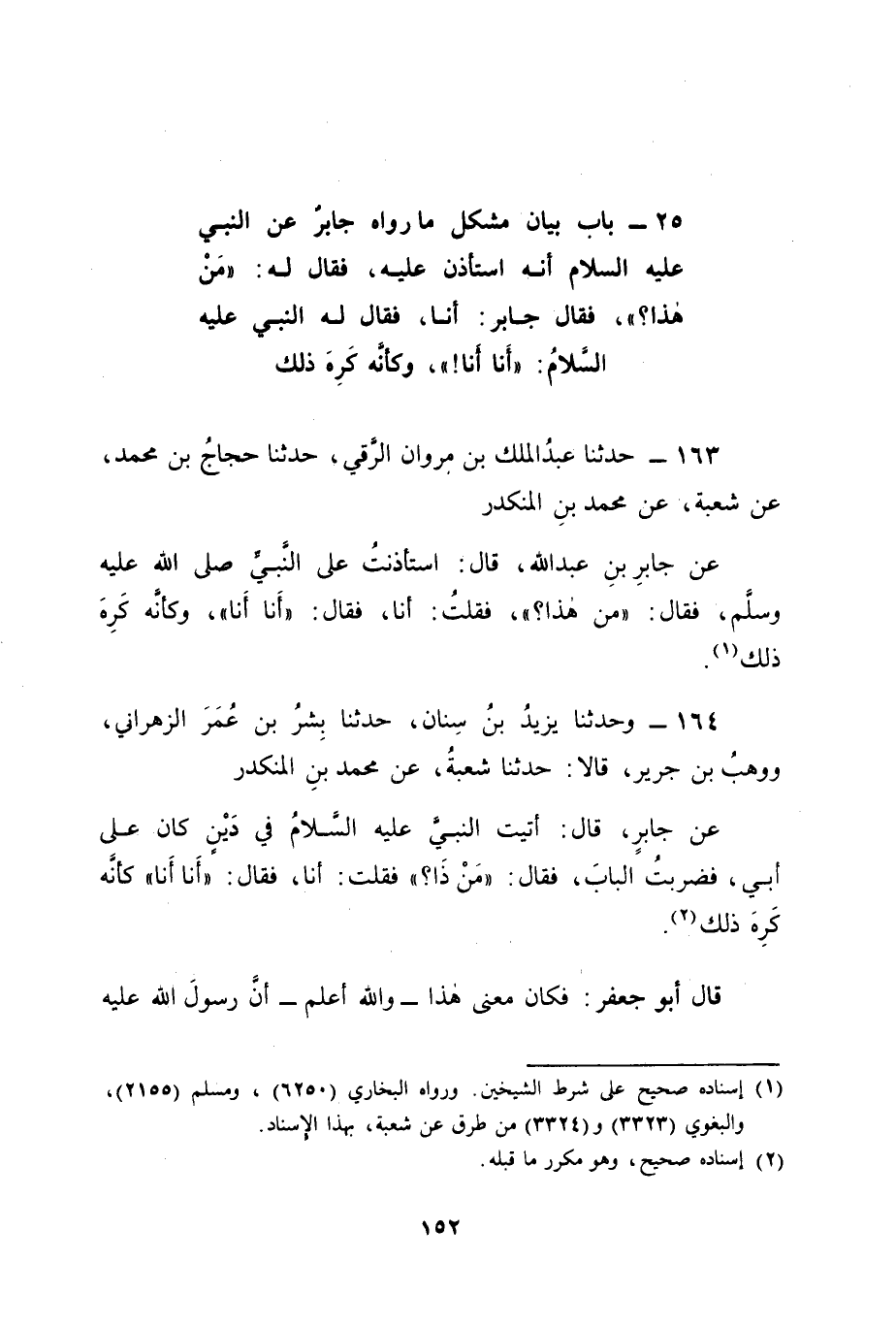 164 - وَحَدَّثَنَا يَزِيدُ بْنُ سِنَانٍ، حَدَّثَنَا بِشْرُ بْنُ عُمَرَ الزَّهْرَانِيُّ، وَوَهْبُ بْنُ جَرِيرٍ، قَالَا: حَدَّثَنَا شُعْبَةُ، عَنْ مُحَمَّدِ بْنِ الْمُنْكَدِرِ، عَنْ جَابِرٍ، قَالَ: أَتَيْتُ النَّبِيَّ عَلَيْهِ السَّلَامُ فِي دَيْنٍ كَانَ عَلَى أَبِي فَضَرَبْتُ الْبَابَ فَقَالَ: " مَنْ ذَا "؟، فَقُلْتُ: أَنَا، فَقَالَ: " أَنَا أَنَا " كَأَنَّهُ كَرِهَ ذَلِكَ قَالَ أَبُو جَعْفَرٍ: فَكَانَ مَعْنَى هَذَا وَاللهُ أَعْلَمُ أَنَّ رَسُولَ اللهِ عَلَيْهِ -[153]- السَّلَامُ. لَمَّا قَرَعَ جَابِرٌ عَلَيْهِ الْبَابَ فَقَالَ لَهُ: مَنْ هَذَا إذْ كَانَ لَمْ يَعْرِفْهُ لِيَعْرِفَهُ فَأَجَابَهُ جَابِرٌ بِمَا أَجَابَهُ بِهِ فَلَمْ يَعْرِفْهُ بِذَلِكَ فَكَانَ سُؤَالُهُ عَلَيْهِ السَّلَامُ إيَّاهُ مَنْ هَذَا يَقْتَضِي جَوَابًا لَمْ يَكُنْ مِنْ جَابِرٍ إلَى حِينَئِذٍ فَكَرِهَ ذَلِكَ مِنْهُ رَسُولُ اللهِ صَلَّى اللَّهُ عَلَيْهِ وَسَلَّمَ وَأَرَادَ مِنْهُ جَوَابًا يُفِيدُهُ عِلْمَ الَّذِي دَقَّ الْبَابَ مَنْ هُوَ وَبِاللهِ التَّوْفِيقُ