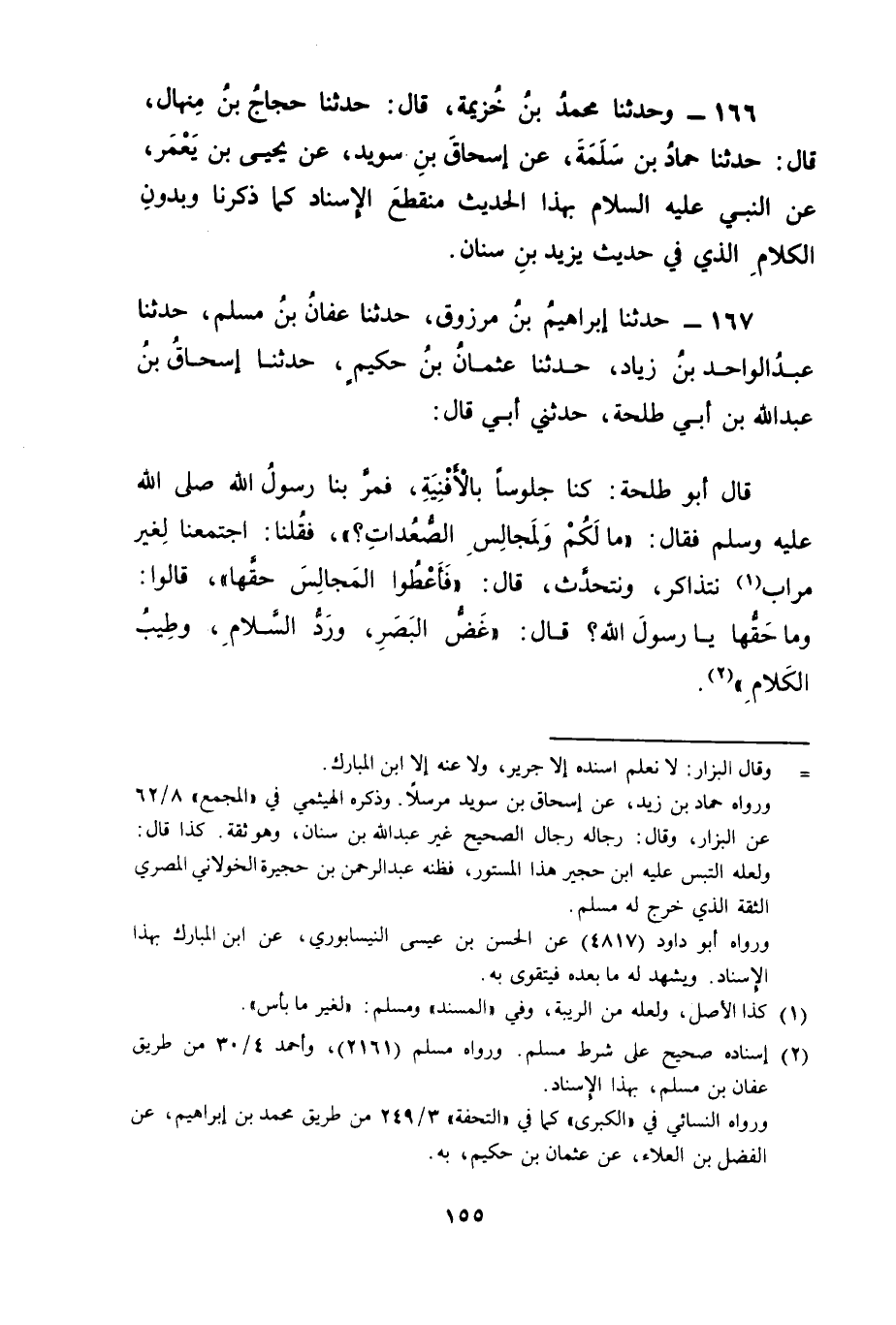 167 - حَدَّثَنَا إبْرَاهِيمُ بْنُ مَرْزُوقٍ، حَدَّثَنَا عَفَّانَ بْنُ مُسْلِمٍ، حَدَّثَنَا عَبْدُ الْوَاحِدِ بْنُ زِيَادٍ، حَدَّثَنَا عُثْمَانُ بْنُ حَكِيمٍ، حَدَّثَنَا إِسْحَاقُ بْنُ عَبْدِ اللهِ بْنِ أَبِي طَلْحَةَ، حَدَّثَنِي أَبِي قَالَ: قَالَ أَبُو طَلْحَةَ: كُنَّا جُلُوسًا بِالْأَفْنِيَةِ فَمَرَّ بِنَا رَسُولُ اللهِ صَلَّى اللَّهُ عَلَيْهِ وَسَلَّمَ فَقَالَ: " مَا لَكُمْ وَلِمَجَالِسِ الصُّعُدَاتِ " فَقُلْنَا: اجْتَمَعْنَا لِغَيْرِ مُرَابٍ نَتَذَاكَرُ وَنَتَحَدَّثُ قَالَ: " فَأَعْطُوا الْمَجَالِسَ حَقَّهَا " قَالُوا: وَمَا حَقُّهَا يَا رَسُولَ اللهِ؟ قَالَ: " غَضُّ الْبَصَرِ وَرَدُّ السَّلَامِ وَطِيبُ الْكَلَامِ "