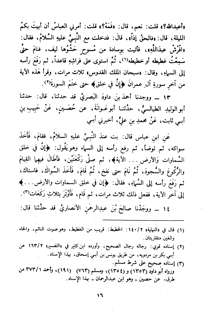 13 - وَوَجَدْنَا أَحْمَدَ بْنَ دَاوُدَ الْبَصْرِيَّ قَدْ حَدَّثَنَا , قَالَ: حَدَّثَنَا أَبُو الْوَلِيدِ الطَّيَالِسِيُّ، حَدَّثَنَا أَبُو عَوَانَةَ، عَنْ حُصَيْنٍ، عَنْ حَبِيبِ بْنِ أَبِي ثَابِتٍ، عَنْ مُحَمَّدِ بْنِ عَلِيٍّ، أَخْبَرَنِي أَبِي، عَنِ ابْنِ عَبَّاسٍ، قَالَ: بِتُّ عِنْدَ النَّبِيِّ عَلَيْهِ السَّلَامُ , فَقَامَ , فَأَخَذَ سِوَاكَهُ , ثُمَّ تَوَضَّأَ , ثُمَّ رَفَعَ رَأْسَهُ إلَى السَّمَاءِ وَهُوَ يَقُولُ: " {إنَّ فِي خَلْقِ السَّمَوَاتِ وَالْأَرْضِ} ". . . الْآيَةَ , ثُمَّ صَلَّى رَكْعَتَيْنِ , فَأَطَالَ فِيهِمَا الْقِيَامَ وَالرُّكُوعَ وَالسُّجُودَ , ثُمَّ نَامَ حَتَّى نَفَخَ , ثُمَّ قَامَ , فَأَخَذَ السِّوَاكَ , فَاسْتَاكَ , ثُمَّ رَفَعَ رَأْسَهُ إلَى السَّمَاءِ , فَقَالَ: " {إنَّ فِي خَلْقِ السَّمَوَاتِ وَالْأَرْضِ} . . إلَى آخِرِ الْآيَةِ " فَفَعَلَ ذَلِكَ ثَلَاثَ مَرَّاتٍ , ثُمَّ قَامَ , فَأَوْتَرَ بِثَلَاثِ رَكَعَاتٍ ".