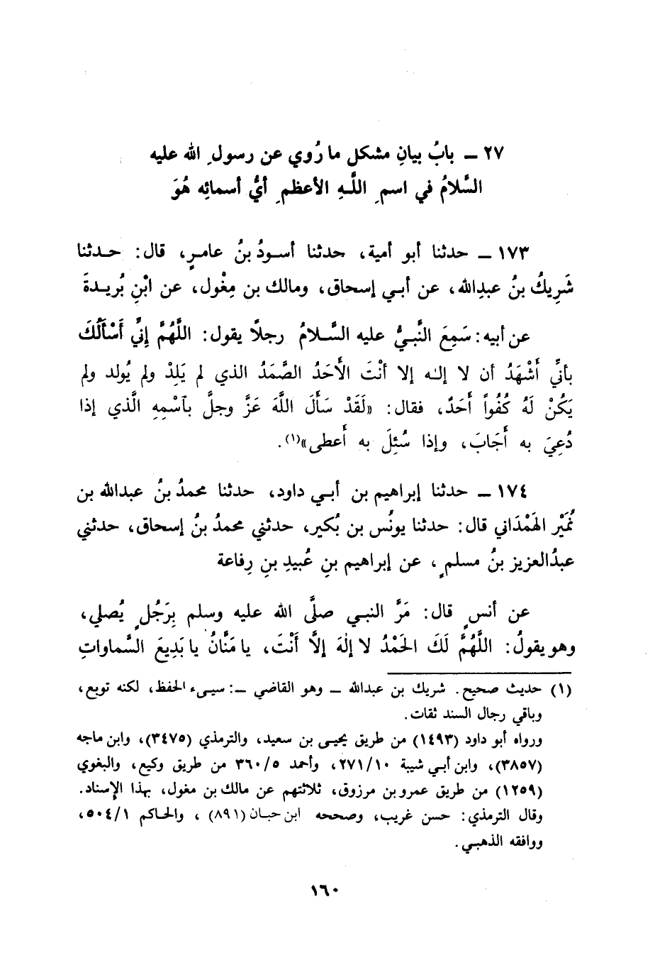 173 - حَدَّثَنَا أَبُو أُمَيَّةَ، حَدَّثَنَا أَسْوَدُ بْنُ عَامِرٍ، قَالَ: حَدَّثَنَا شَرِيكُ بْنُ عَبْدِ اللهِ، عَنْ أَبِي إِسْحَاقَ، وَمَالِكِ بْنِ مِغْوَلٍ، عَنِ ابْنِ بُرَيْدَةَ، عَنْ أَبِيهِ، سَمِعَ النَّبِيُّ عَلَيْهِ السَّلَامُ رَجُلًا يَقُولُ: اللهُمَّ إنِّي أَسْأَلُكَ بِأَنِّي أَشْهَدُ أَنْ لَا إلَهَ إلَّا أَنْتَ الْأَحَدُ الصَّمَدُ الَّذِي لَمْ يَلِدْ وَلَمْ يُولَدْ وَلَمْ يَكُنْ لَهُ كُفُوًا أَحَدٌ، فَقَالَ: " لَقَدْ سَأَلَ اللهَ عَزَّ وَجَلَّ بِاسْمِهِ الَّذِي إذَا دُعِيَ بِهِ أَجَابَ وَإِذَا سُئِلَ بِهِ أَعْطَى "