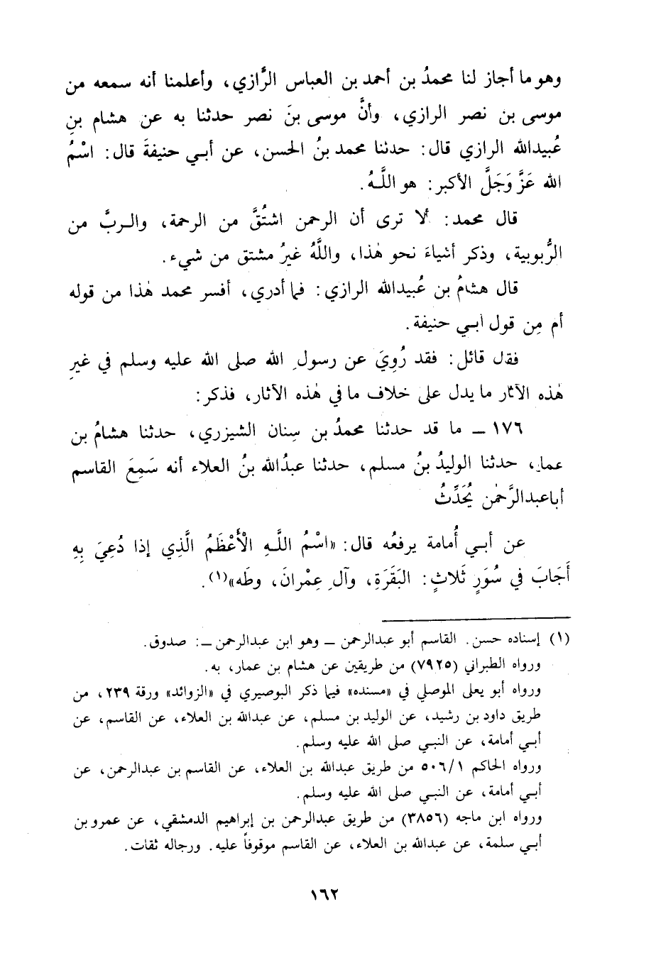 وَهُوَ مَا أَجَازَ لَنَا مُحَمَّدُ بْنُ أَحْمَدَ بْنِ الْعَبَّاسِ الرَّازِيُّ وَأَعْلَمَنَا أَنَّهُ سَمِعَهُ مِنْ مُوسَى بْنِ نَصْرٍ الرَّازِيِّ وَأَنَّ مُوسَى بْنَ نَصْرٍ , حَدَّثَنَا بِهِ عَنْ هِشَامِ بْنِ عُبَيْدِ اللهِ الرَّازِيِّ قَالَ: حَدَّثَنَا مُحَمَّدُ بْنُ الْحَسَنِ , عَنْ أَبِي حَنِيفَةَ قَالَ: " اسْمُ اللهِ عَزَّ وَجَلَّ الْأَكْبَرُ هُوَ اللهُ " قَالَ مُحَمَّدٌ: أَلَا تَرَى أَنَّ الرَّحْمَنَ اشْتُقَّ مِنَ الرَّحْمَةِ وَالرَّبَّ مِنَ الرُّبُوبِيَّةِ وَذَكَرَ أَشْيَاءَ نَحْوَ هَذَا وَاللهُ غَيْرُ مُشْتَقٍّ مِنْ شَيْءٍ. قَالَ هِشَامُ بْنُ عُبَيْدِ اللهِ الرَّازِيُّ: فَمَا أَدْرِي أَفَسَّرَ مُحَمَّدٌ هَذَا مِنْ قَوْلِهِ أَمْ مِنْ قَوْلِ أَبِي حَنِيفَةَ فَقَالَ قَائِلٌ: فَقَدْ رُوِيَ عَنْ رَسُولِ اللهِ صَلَّى اللَّهُ عَلَيْهِ وَسَلَّمَ فِي غَيْرِ هَذِهِ الْآثَارِ مَا يَدُلُّ عَلَى خِلَافِ مَا فِي هَذِهِ الْآثَارِ فَذَكَرَ