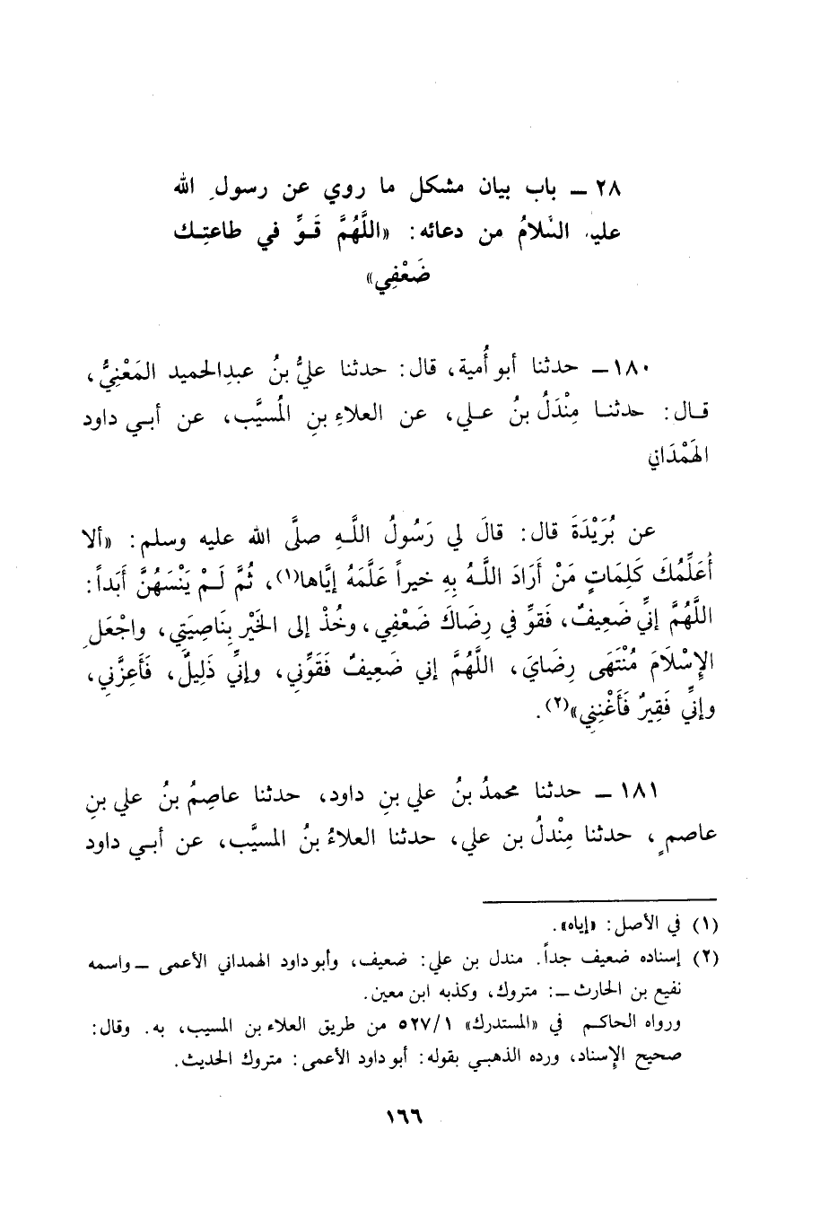 181 - حَدَّثَنَا مُحَمَّدُ بْنُ عَلِيِّ بْنِ دَاوُدَ، حَدَّثَنَا عَاصِمُ بْنُ عَلِيِّ بْنِ عَاصِمٍ، حَدَّثَنَا مِنْدَلُ بْنُ عَلِيٍّ، حَدَّثَنَا الْعَلَاءُ بْنُ الْمُسَيِّبِ، عَنْ أَبِي دَاوُدَ -[167]- الْهَمْدَانِيِّ، عَنْ بُرَيْدَةَ الْأَسْلَمِيِّ، ثُمَّ ذَكَرَ مِثْلَهُ إلَّا أَنَّهُ قَالَ: ثُمَّ " لَمْ يَسْأَلْهُنَّ إيَّاهُ أَبَدًا ". فَتَأَمَّلْنَا مَا فِي هَذَيْنِ الْحَدِيثَيْنِ عَنْ رَسُولِ اللهِ عَلَيْهِ السَّلَامُ فَوَجَدْنَا الضَّعْفَ لَا يَكُونُ قُوَّةً أَبَدًا وَوَجَدْنَا الْقُوَّةَ لَا تَكُونُ ضَعْفًا أَبَدًا ; لِأَنَّ كُلَّ وَاحِدٍ مِنْهُمَا ضِدٌّ لِصَاحِبِهِ وَلَا يَكُونُ الشَّيْءُ ضِدًّا لِنَفْسِهِ أَبَدًا إنَّمَا يَكُونُ ضِدًّا لِغَيْرِهِ وَكَانَ الضَّعْفُ وَالْقُوَّةُ لَا يَقُومَانِ بِأَنْفُسِهِمَا إنَّمَا يَكُونَانِ حَالَّيْنِ فِي أَبْدَانِ الْحَيَوَانِ مِنْ بَنِي آدَمَ وَمِمَّا سِوَاهُمْ فَيَعُودُ مَا يَحُلُّ فِيهِ الضَّعْفُ مِنْهُمَا ضَعِيفًا وَمَا يَحُلُّ فِيهِ الْقُوَّةُ مِنْهُمَا قَوِيًّا. فَعَقَلْنَا بِذَلِكَ أَنَّ دُعَاءَهُ صَلَّى اللَّهُ عَلَيْهِ وَسَلَّمَ اللهَ عَزَّ وَجَلَّ أَنْ يَجْعَلَ ضَعْفَهُ قَوِيًّا إنَّمَا مُرَادُهُ فِيهِ وَاللهُ أَعْلَمُ أَنْ يَجْعَلَ مَا فِيهِ الضَّعْفُ مِنْهُ , وَهُوَ بَدَنُهُ قَوِيًّا فَهَذَا أَحْسَنُ مَا وَجَدْنَاهُ فِي تَأْوِيلِ هَذَا الْحَدِيثِ , وَاللهَ نَسْأَلُهُ التَّوْفِيقَ