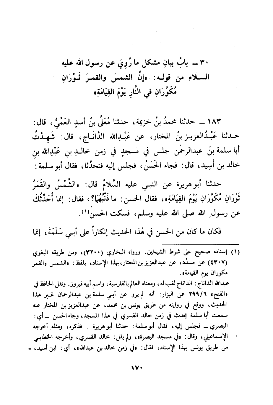 183 - حَدَّثَنَا مُحَمَّدُ بْنُ خُزَيْمَةَ، حَدَّثَنَا مُعَلَّى بْنُ أَسَدٍ الْعَمِّيُّ، قَالَ: حَدَّثَنَا عَبْدُ الْعَزِيزِ بْنُ الْمُخْتَارِ، عَنْ عَبْدِ اللهِ الدَّانَاجِ، قَالَ: شَهِدْتُ أَبَا سَلَمَةَ بْنَ عَبْدِ الرَّحْمَنِ جَلَسَ فِي مَسْجِدٍ فِي زَمَنِ خَالِدِ بْنِ عَبْدِ اللهِ بْنِ خَالِدِ بْنِ أُسَيْدَ قَالَ: فَجَاءَ الْحَسَنُ فَجَلَسَ إلَيْهِ فَتَحَدَّثَا فَقَالَ أَبُو سَلَمَةَ: حَدَّثَنَا أَبُو هُرَيْرَةَ عَنِ النَّبِيِّ عَلَيْهِ السَّلَامُ قَالَ: " الشَّمْسُ وَالْقَمَرُ ثَوْرَانِ مُكَوَّرَانِ يَوْمَ الْقِيَامَةِ " فَقَالَ الْحَسَنُ: مَا ذَنْبُهُمَا؟ فَقَالَ: إنَّمَا أُحَدِّثُكَ عَنْ رَسُولِ اللهِ صَلَّى اللَّهُ عَلَيْهِ وَسَلَّمَ فَسَكَتَ الْحَسَنُ فَكَانَ مَا كَانَ مِنَ الْحَسَنِ فِي هَذَا الْحَدِيثِ إنْكَارًا عَلَى أَبِي سَلَمَةَ إنَّمَا -[171]- كَانَ وَاللهُ أَعْلَمُ لِمَا وَقَعَ فِي قَلْبِهِ أَنَّهُمَا يُلْقَيَانِ فِي النَّارِ لِيُعَذَّبَا بِذَلِكَ فَلَمْ يَكُنْ مِنْ أَبِي سَلَمَةَ لَهُ عَنْ ذَلِكَ جَوَابٌ , وَجَوَابُنَا لَهُ فِي ذَلِكَ عَنْ أَبِي سَلَمَةَ أَنَّ الشَّمْسَ وَالْقَمَرَ إنَّمَا يُكَوَّرَانِ فِي النَّارِ لِيُعَذِّبَا أَهْلَ النَّارِ لَا أَنْ يَكُونَا مُعَذَّبَيْنِ فِي النَّارِ وَأَنْ يَكُونَا فِي تَعْذِيبِ مَنْ فِي النَّارِ كَسَائِرِ مَلَائِكَةِ اللهِ الَّذِينَ يُعَذِّبُونَ أَهْلَهَا أَلَا تَرَى إلَى قَوْلِهِ تَعَالَى: {يَا أَيُّهَا الَّذِينَ آمَنُوا قُوا أَنْفُسَكُمْ وَأَهْلِيكُمْ نَارًا وَقُودُهَا النَّاسُ وَالْحِجَارَةُ عَلَيْهَا مَلَائِكَةٌ غِلَاظٌ شِدَادٌ لَا يَعْصُونَ اللهَ مَا أَمَرَهُمْ} [التحريم: 6] . أَيْ: مِنْ تَعْذِيبِ أَهْلِ النَّارِ {وَيَفْعَلُونَ مَا يُؤْمَرُونَ} [التحريم: 6] , وَكَذَلِكَ الشَّمْسُ وَالْقَمَرُ هُمَا فِيهَا بِهَذِهِ الْمَنْزِلَةِ مُعَذِّبَانِ لِأَهْلِ النَّارِ بِذُنُوبِهِمْ لَا مُعَذَّبَانِ فِيهَا إذْ لَا ذُنُوبَ لَهُمَا وَقَدْ رُوِيَ عَنْ أَنَسٍ عَنْ رَسُولِ اللهِ عَلَيْهِ السَّلَامُ فِي الشَّمْسِ وَالْقَمَرِ هَذَا الْمَعْنَى أَيْضًا وَفِيهِ زِيَادَةُ أَنَّهُمَا عَقِيرَانِ