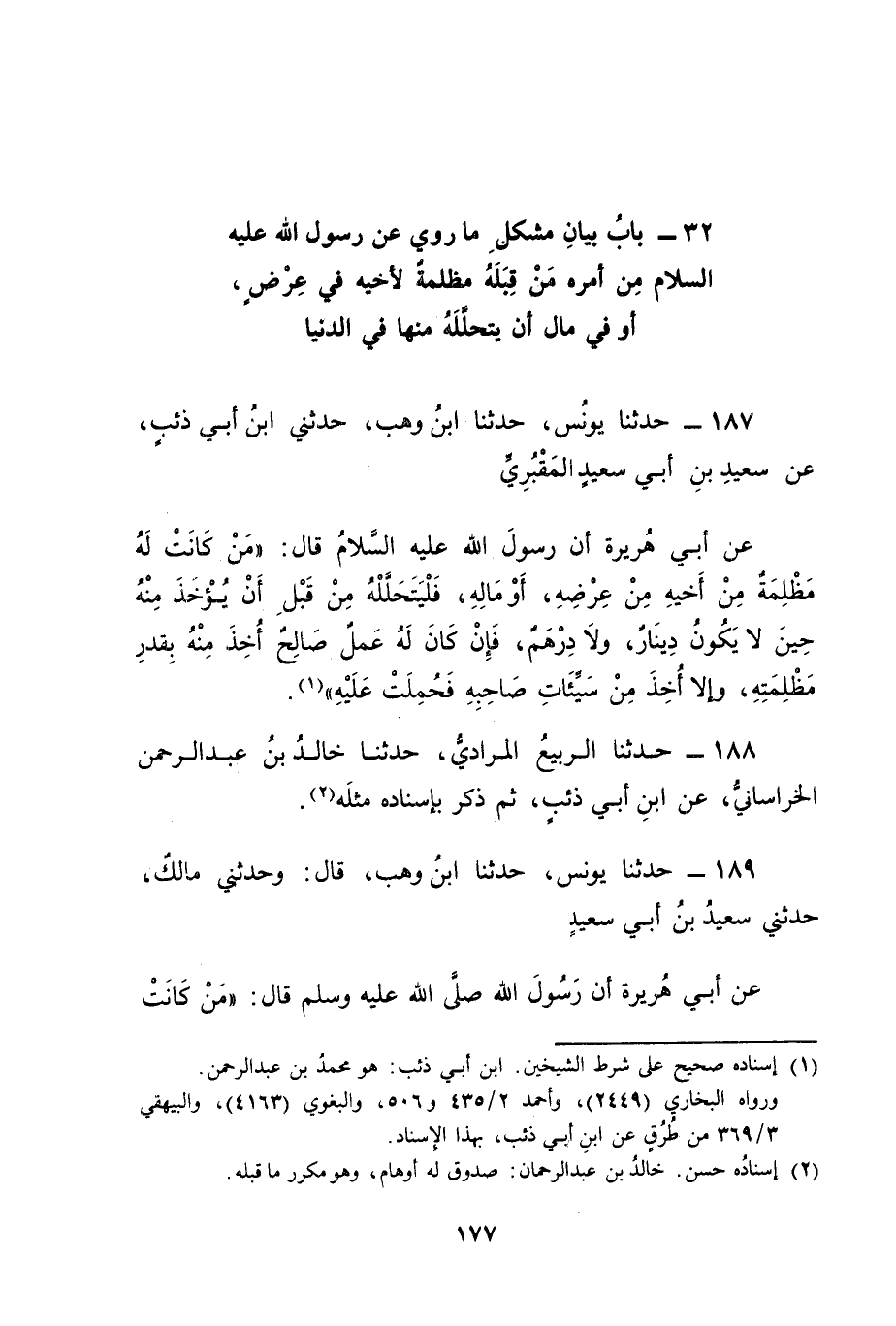 189 - حَدَّثَنَا يُونُسُ، حَدَّثَنَا ابْنُ وَهْبٍ، قَالَ: وَحَدَّثَنِي مَالِكٌ، حَدَّثَنِي سَعِيدُ بْنُ أَبِي سَعِيدٍ، عَنْ أَبِي هُرَيْرَةَ، أَنَّ رَسُولَ اللهِ صَلَّى اللَّهُ عَلَيْهِ وَسَلَّمَ قَالَ: " مَنْ كَانَتْ -[178]- عِنْدَهُ مَظْلِمَةٌ لِأَخِيهِ فِي عِرْضٍ أَوْ فِي مَالٍ فَلْيَأْتِهِ فَلْيُحَلِّلْهُ مِنْهَا فَإِنَّهُ لَيْسَ ثَمَّ دِينَارٌ وَلَا دِرْهَمٌ مِنْ قَبْلِ أَنْ يُؤْخَذَ لِأَخِيهِ مِنْ حَسَنَاتِهِ فَإِنْ لَمْ يَكُنْ لَهُ حَسَنَاتٌ أُخِذَ مِنْ سَيِّئَاتِ أَخِيهِ فَطُرِحَتْ عَلَيْهِ " قَالَ أَبُو جَعْفَرٍ: فَتَأَمَّلْنَا هَذَا الْحَدِيثَ فَكَانَ مَا فِي رِوَايَةِ ابْنِ أَبِي ذِئْبٍ مِنْهُ " مَنْ كَانَتْ لَهُ مَظْلِمَةٌ مِنْ أَخِيهِ مِنْ عِرْضِهِ أَوْ مَالِهِ فَلْيَتَحَلَّلْهُ. فَكَانَ مَعْنَى ذَلِكَ عِنْدَنَا وَاللهُ أَعْلَمُ فَلْيَتَحَلَّلْهُ بِمَا يَتَحَلَّلُ بِهِ مِنْ مِثْلِهِ مِنْ دَفْعِ مَالٍ مَكَانَ مَالٍ وَمِنْ عَفْوٍ عَنْ عُقُوبَةٍ وَجَبَتْ فِي انْتِهَاكِهِ عِرْضَهُ ; لِأَنَّ ذَلِكَ الِانْتِهَاكَ يُوجِبُ عَلَى الْمُنْتَهِكِ الْعُقُوبَةَ فِي بَدَنِهِ كَقَوْلِ الرَّجُلِ لِلرَّجُلِ: يَا فَاسِقُ أَوْ يَا خَبِيثُ أَوْ يَا سَارِقُ وَلَا تَقُومُ الْحُجَّةُ لَهُ عَلَيْهِ أَنَّهُ كَذَلِكَ فَعَلَى ذَلِكَ الْقَائِلِ الْعُقُوبَةُ وَلِلْوَاجِبَةِ لَهُ تِلْكَ الْعُقُوبَةُ الْعَفْوُ عَنْهُ لَا اخْتِلَافَ بَيْنَ أَهْلِ الْعِلْمِ فِي ذَلِكَ , وَذَلِكَ التَّحْلِيلُ الَّذِي يُرَادُ مِنْ هَذِهِ الْعُقُوبَةِ وَاللهُ أَعْلَمُ. وَفِي حَدِيثِ مَالِكٍ مَكَانَ ذَلِكَ فَلْيَأْتِهِ فَلْيُحَلِّلْهُ مِنْهَا فَذَلِكَ عَلَى إتْيَانِ مَنْ لَهُ الْمَظْلِمَةُ لَا عَلَى إتْيَانِ مَنْ هِيَ عَلَيْهِ , وَذَلِكَ بَعِيدٌ فِي الْمَعْنَى ; لِأَنَّ الَّذِي لَهُ الْمَظْلِمَةُ غَيْرُ مَخُوفٍ عَلَيْهِ مِنْهَا فِي الْآخِرَةِ وَإِنَّمَا الْخَوْفُ فِي الْآخِرَةِ عَلَى مَنْ هِيَ قِبَلَهُ فَبَانَ بِمَا ذَكَرْنَا أَنَّ الْأَوْلَى مِمَّا اخْتَلَفَ فِيهِ مَالِكٌ، وَابْنُ أَبِي ذِئْبٍ فِي هَذَا الْحَدِيثِ هُوَ مَا رَوَاهُ عَلَيْهِ ابْنُ أَبِي ذِئْبٍ لَا مَا رَوَاهُ عَلَيْهِ مَالِكٌ , -[179]- ثُمَّ رَجَعْنَا إلَى مَا فِي حَدِيثِهِمَا جَمِيعًا مِنْ قَوْلِ رَسُولِ اللهِ عَلَيْهِ السَّلَامُ: " مِنْ قَبْلِ أَنْ يُؤْخَذَ مِنْهُ حِينَ لَا يَكُونُ دِينَارٌ وَلَا دِرْهَمٌ فَإِنْ كَانَ لَهُ عَمَلٌ صَالِحٌ أُخِذَ مِنْهُ بِقَدْرِ مَظْلِمَتِهِ وَإِلَّا أُخِذَ مِنْ سَيِّئَاتِ صَاحِبِهِ فَحُمِلَتْ عَلَيْهِ ". فَكَانَ ذَلِكَ عِنْدَنَا , وَاللهُ أَعْلَمُ رَاجِعًا عَلَى الْمَظْلِمَةِ فِي الْمَالِ لَا عَلَى الْمَظْلِمَةِ فِي الْعِرْضِ ; لِأَنَّ الْمَظْلِمَةَ فِي الْمَالِ تُوجِبُ مَالًا , وَهُوَ الدَّنَانِيرُ وَالدَّرَاهِمُ فَإِذَا كَانَ غَيْرَ مَقْدُورٍ عَلَيْهِمَا عَادَ صَاحِبُ الْمَظْلِمَةِ فِي حَقِّهِ بِمَظْلِمَتِهِ إلَى حَسَنَاتِ ظَالِمِهِ وَأُخِذَ مِنْهَا بِقَدْرِ مَظْلِمَتِهِ فَإِنْ لَمْ يَكُنْ لَهُ حَسَنَاتٌ أُخِذَ مِنْ سَيِّئَاتِهِ فَأُلْقِيَ عَلَى ظَالِمِهِ بِمِقْدَارِ مَظْلِمَتِهِ وَلَيْسَ كَذَلِكَ الْمَظْلِمَةُ فِي الْعِرْضِ ; لِأَنَّ الْوَاجِبَ بِهَا هُوَ الْعُقُوبَةُ فِي بَدَنِ الظَّالِمِ بِجَلْدِهِ عَلَيْهَا , وَذَلِكَ مَقْدُورٌ عَلَيْهِ فِي الْآخِرَةِ مِنْ بَدَنِهِ كَمَا كَانَ مَقْدُورًا عَلَيْهِ مِنْهُ فِي الدُّنْيَا. وَمِمَّا يُقَوِّي مَا قُلْنَاهُ فِي ذَلِكَ