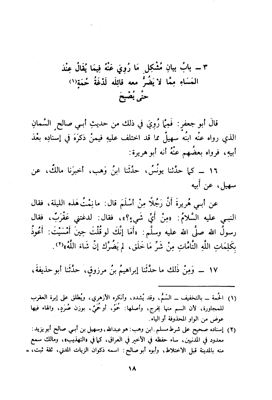 بَابُ بَيَانِ مُشْكِلِ مَا رُوِيَ عَنْهُ، فِيمَا يُقَالُ عِنْدَ الْمَسَاءِ مِمَّا لَا يَضُرُّ مَعَهُ قَائِلَهِ لَدْغَةُ حُمَةٍ حَتَّى يُصْبِحَ قَالَ أَبُو جَعْفَرٍ: فَمِمَّا رُوِيَ فِي ذَلِكَ مِنْ حَدِيثِ أَبِي صَالِحٍ السَّمَّانِ الَّذِي رَوَاهُ عَنْهُ ابْنُهُ سُهَيْلٌ مِمَّا قَدِ اخْتُلِفَ عَلَيْهِ فِيمَنْ ذَكَرَهُ فِي إسْنَادِهِ بَعْدَ أَبِيهِ , فَرَوَاهُ بَعْضُهُمْ عَنْهُ أَنَّهُ أَبُو هُرَيْرَةَ