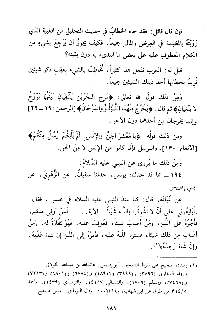 194 - مِمَّا قَدْ حَدَّثَنَاهُ يُونُسُ، حَدَّثَنَا سُفْيَانُ، عَنِ الزُّهْرِيِّ، عَنْ أَبِي إدْرِيسَ، عَنْ عُبَادَةَ، قَالَ: كُنَّا عِنْدَ النَّبِيِّ عَلَيْهِ السَّلَامُ فِي مَجْلِسٍ فَقَالَ: " تُبَايِعُونِي عَلَى أَنْ لَا تُشْرِكُوا بِاللهِ شَيْئًا الْآيَةَ فَمَنْ أَوْفَى مِنْكُمْ فَأَجْرُهُ عَلَى اللهِ وَمَنْ أَصَابَ شَيْئًا فَعُوقِبَ عَلَيْهِ فَهُوَ كَفَّارَةٌ لَهُ وَمَنْ أَصَابَ مِنْ ذَلِكَ شَيْئًا فَسَتَرَهُ اللهُ عَلَيْهِ فَأَمْرُهُ إلَى اللهِ إنْ شَاءَ عَذَّبَهُ , وَإِنْ شَاءَ رَحِمَهُ " -[182]- قَالَ أَبُو جَعْفَرٍ: وَنَحْنُ نَعْلَمُ أَنَّ مَنْ أَشْرَكَ بِاللهِ فَعُوقِبَ عَلَى شِرْكِهِ لَمْ تَكُنْ تِلْكَ الْعُقُوبَةُ كَفَّارَةً لَهُ ; لِأَنَّ اللهَ تَعَالَى يَقُولُ: {إنَّ اللهَ لَا يَغْفِرُ أَنْ يُشْرَكَ بِهِ وَيَغْفِرُ مَا دُونَ ذَلِكَ لِمَنْ يَشَاءُ} [النساء: 48] ، وَأَنَّهُ إنْ لَمْ يُعَاقَبْ وَسُتِرَ عَلَيْهِ لَمْ يَكُنْ مِمَّنْ قَدْ يَجُوزُ أَنْ يَغْفِرَ اللهُ لَهُ فَكَانَ قَوْلُهُ عَلَيْهِ السَّلَامُ: " فَمَنْ أَصَابَ مِنْ ذَلِكَ شَيْئًا ". إنَّمَا هُوَ عَلَى بَعْضِ تِلْكَ الْأَشْيَاءِ لَا عَلَى كُلِّهَا , فَكَذَلِكَ قَوْلُهُ فِي تَحْوِيلِ بَعْضِ حَسَنَاتِ الظَّالِمِ إلَى الْمَظْلُومِ وَفِي تَحْوِيلِ بَعْضِ سَيِّئَاتِ الْمَظْلُومِ إلَى الظَّالِمِ لَيْسَ ذَلِكَ فِي الظُّلْمِ فِي الْأَعْرَاضِ وَإِنَّمَا هُوَ فِي الظُّلْمِ فِي الْأَمْوَالِ لَا الظُّلْمِ فِي الْأَعْرَاضِ وَاللهَ نَسْأَلُهُ التَّوْفِيقَ