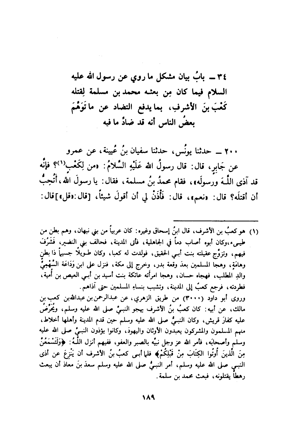 بَابُ بَيَانِ مُشْكِلِ مَا رُوِيَ عَنْ رَسُولِ اللهِ عَلَيْهِ السَّلَامُ فِيمَا كَانَ مِنْ بَعْثِهِ مُحَمَّدَ بْنَ مَسْلَمَةَ لِقَتْلِهِ كَعْبَ بْنَ الْأَشْرَفِ بِمَا يَدْفَعُ التَّضَادَّ عَنْ مَا تَوَهَّمَ بَعْضُ النَّاسِ أَنَّهُ قَدْ ضَادَّ مَا فِيهِ