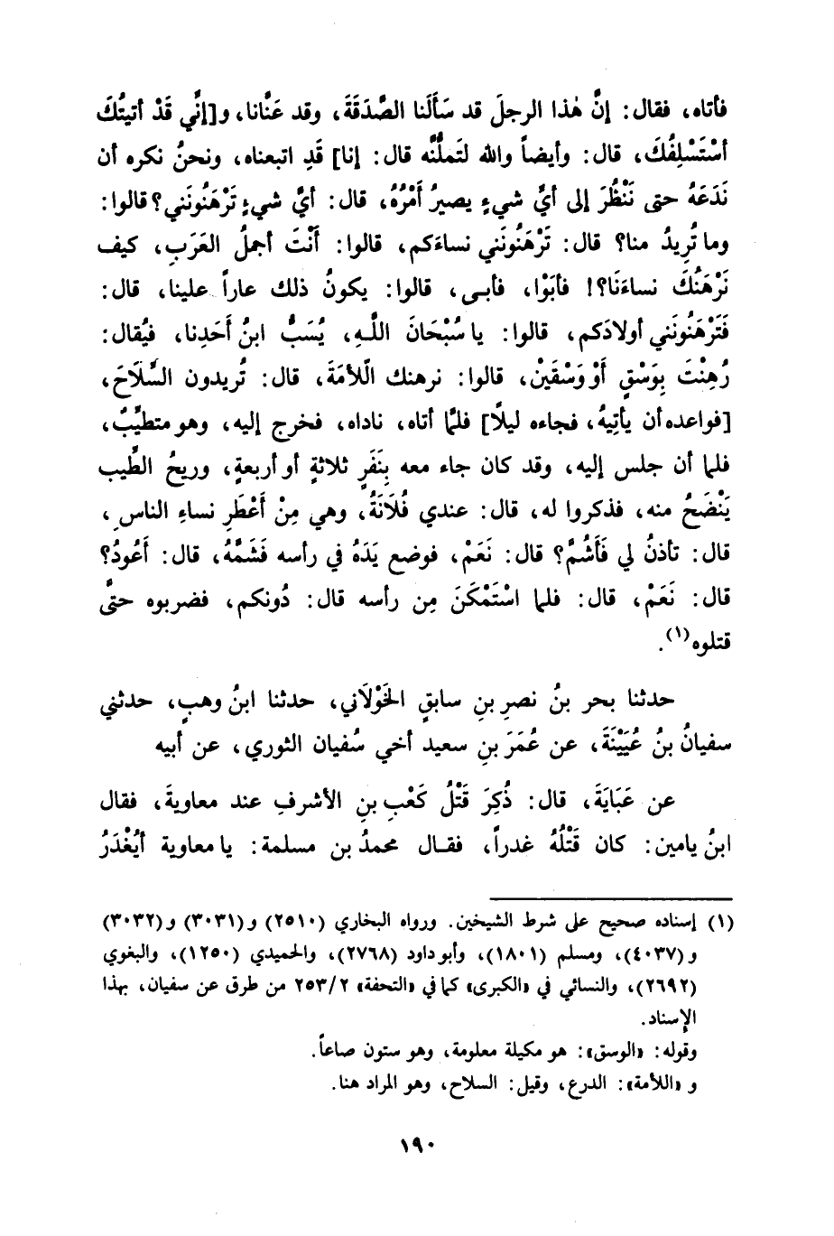 حَدَّثَنَا بَحْرُ بْنُ نَصْرِ بْنِ سَابِقٍ الْخَوْلَانِيُّ , حَدَّثَنَا ابْنُ وَهْبٍ , حَدَّثَنِي سُفْيَانُ بْنُ عُيَيْنَةَ , عَنْ عُمَرَ بْنِ سَعِيدٍ أَخِي سُفْيَانَ الثَّوْرِيِّ , عَنْ أَبِيهِ , عَنْ عَبَايَةَ: قَالَ ذُكِرَ قَتْلُ كَعْبِ بْنِ الْأَشْرَفِ عِنْدَ مُعَاوِيَةَ فَقَالَ ابْنُ يَامِينَ: كَانَ قَتْلُهُ غَدْرًا فَقَالَ مُحَمَّدُ بْنُ مَسْلَمَةَ: " يَا مُعَاوِيَةُ أَيُغْدَرُ -[191]- عِنْدَكَ رَسُولُ اللهِ عَلَيْهِ السَّلَامُ وَلَا تُنْكِرُ، وَاللهِ لَا يُظِلُّنِي وَإِيَّاكَ سَقْفُ بَيْتٍ أَبَدًا وَلَا يَحْلُو لِي دَمُ هَذَا إلَّا قَتَلْتُهُ " فَتَوَهَّمَ مُتَوَهِّمٌ أَنَّ فِيمَا رَوَيْنَا مِمَّا كَانَ مِنْ مُحَمَّدِ بْنِ مَسْلَمَةَ وَأَصْحَابِهِ قَدْ دَخَلُوا بِهِ فِي خِلَافِ مَا رُوِيَ عَنْ رَسُولِ اللهِ عَلَيْهِ السَّلَامُ