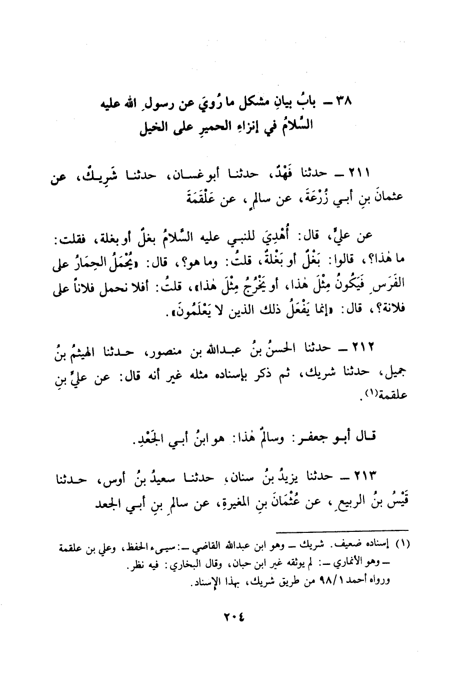 213 - حَدَّثَنَا يَزِيدُ بْنُ سِنَانٍ، حَدَّثَنَا سَعِيدُ بْنُ أَوْسٍ، حَدَّثَنَا قَيْسُ بْنُ الرَّبِيعِ، عَنْ عُثْمَانَ بْنِ الْمُغِيرَةِ، عَنْ سَالِمِ بْنِ أَبِي الْجَعْدِ، -[205]- عَنْ عَلِيٍّ، قَالَ: " نَهَانَا رَسُولُ اللهِ عَلَيْهِ السَّلَامُ أَنْ نَحْمِلَ الْحُمُرَ عَلَى الْبَرَاذِينِ "
