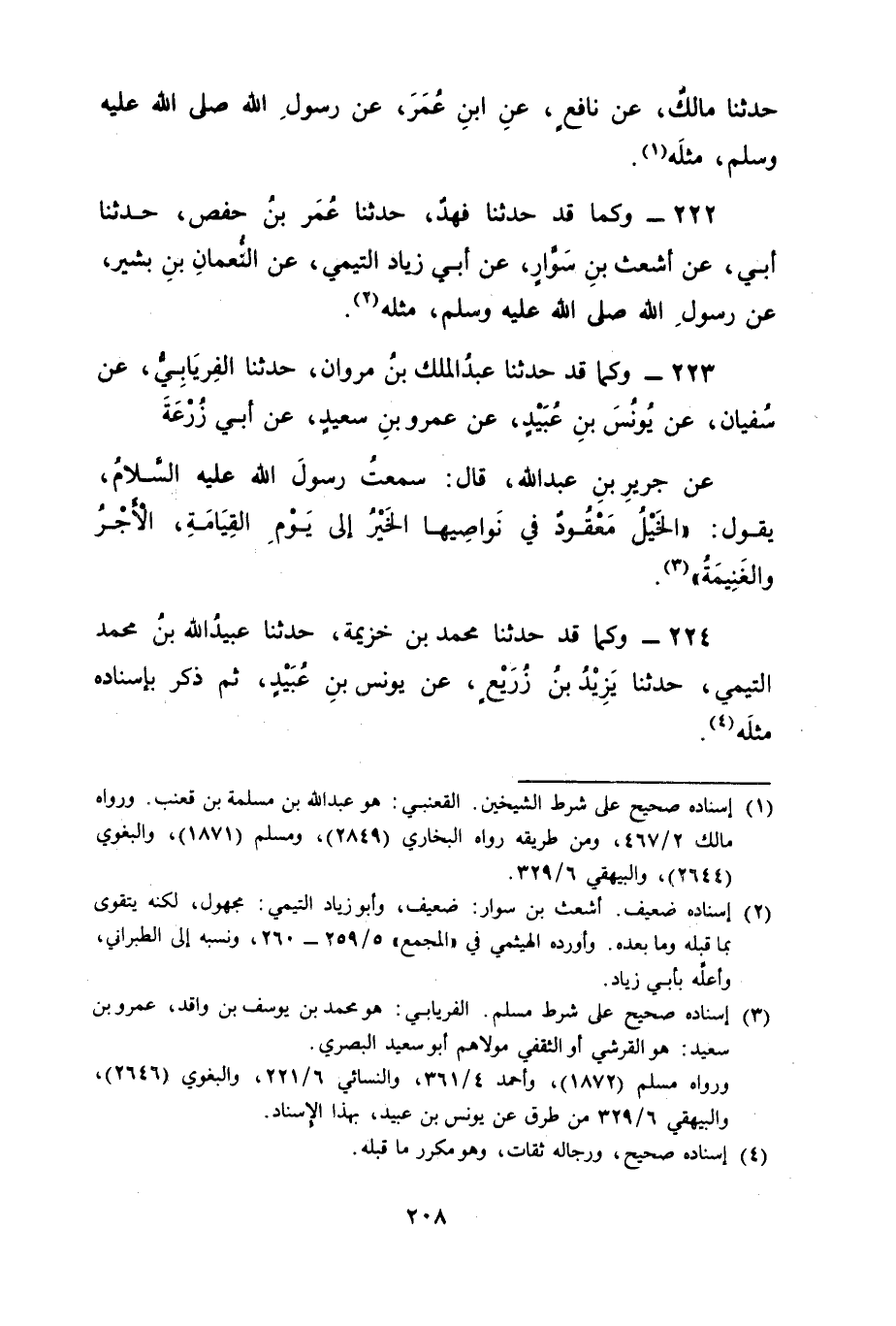 223 - وَكَمَا قَدْ حَدَّثَنَا عَبْدُ الْمَلِكِ بْنُ مَرْوَانَ، حَدَّثَنَا الْفِرْيَابِيُّ، عَنْ سُفْيَانَ، عَنْ يُونُسَ بْنِ عُبَيْدٍ، عَنْ عَمْرِو بْنِ سَعِيدٍ، عَنْ أَبِي زُرْعَةَ، عَنْ جَرِيرِ بْنِ عَبْدِ اللهِ، قَالَ: سَمِعْتُ رَسُولَ اللهِ عَلَيْهِ السَّلَامُ يَقُولُ: " الْخَيْلُ مَعْقُودٌ فِي نَوَاصِيهَا الْخَيْرُ إلَى يَوْمِ الْقِيَامَةِ الْأَجْرُ وَالْغَنِيمَةُ "