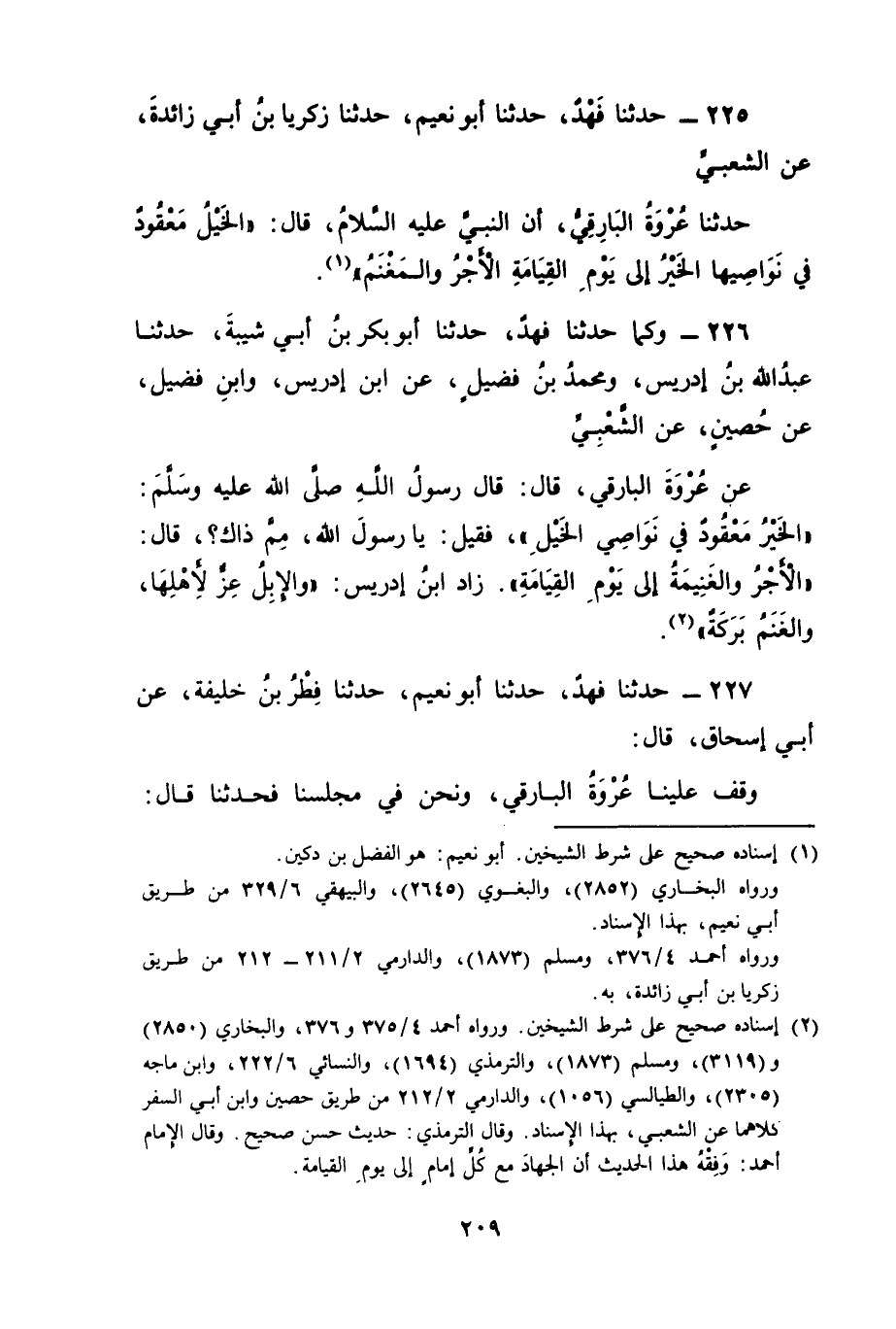 225 - حَدَّثَنَا فَهْدٌ، حَدَّثَنَا أَبُو نُعَيْمٍ، حَدَّثَنَا زَكَرِيَّا بْنُ أَبِي زَائِدَةَ، عَنِ الشَّعْبِيِّ، حَدَّثَنَا عُرْوَةُ الْبَارِقِيُّ، أَنَّ النَّبِيَّ عَلَيْهِ السَّلَامُ قَالَ: " الْخَيْلُ مَعْقُودٌ فِي نَوَاصِيهَا الْخَيْرُ إلَى يَوْمِ الْقِيَامَةِ الْأَجْرُ وَالْمَغْنَمُ "