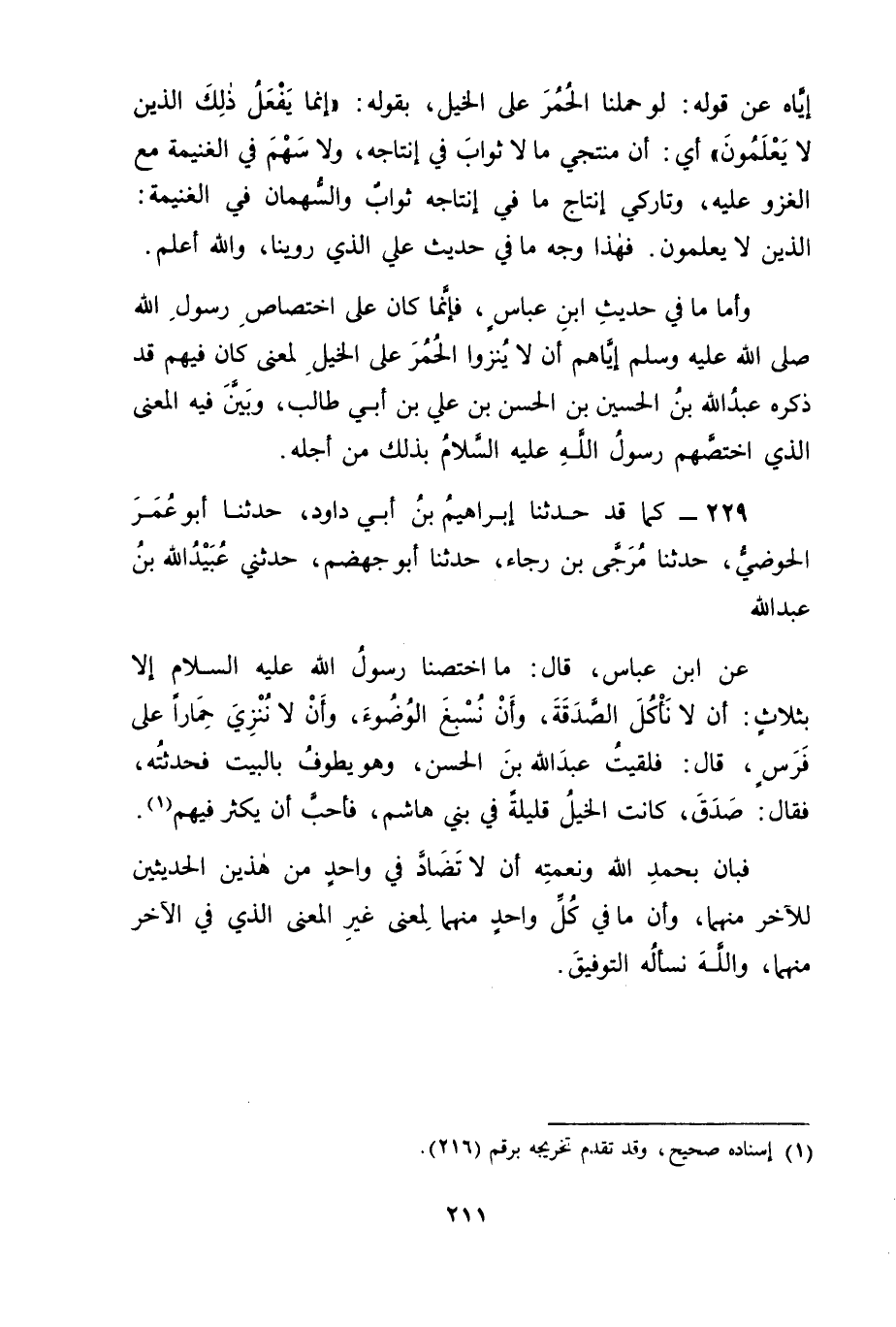 229 - كَمَا قَدْ حَدَّثَنَا إبْرَاهِيمُ بْنُ أَبِي دَاوُدَ، حَدَّثَنَا أَبُو عُمَرَ الْحَوْضِيُّ، حَدَّثَنَا مُرَجَّى بْنُ رَجَاءٍ، حَدَّثَنَا أَبُو جَهْضَمٍ، حَدَّثَنِي عُبَيْدُ اللهِ بْنُ عَبْدِ اللهِ، عَنِ ابْنِ عَبَّاسٍ، قَالَ: " مَا اخْتَصَّنَا رَسُولُ اللهِ عَلَيْهِ السَّلَامُ إلَّا بِثَلَاثٍ: أَنْ لَا نَأْكُلَ الصَّدَقَةَ , وَأَنْ نُسْبِغَ الْوُضُوءَ , وَأَنْ لَا نُنْزِيَ حِمَارًا عَلَى فَرَسٍ ". قَالَ: فَلَقِيتُ عَبْدَ اللهِ بْنَ الْحَسَنِ وَهُوَ يَطُوفُ بِالْبَيْتِ , فَحَدَّثْتُهُ فَقَالَ: صَدَقَ، كَانَتِ الْخَيْلُ قَلِيلَةً فِي بَنِي هَاشِمٍ فَأَحَبَّ أَنْ يَكْثُرَ فِيهِمْ فَبَانَ بِحَمْدِ اللهِ وَنِعْمَتِهِ أَنْ لَا تَضَادَّ فِي وَاحِدٍ مِنْ هَذَيْنِ الْحَدِيثَيْنِ لِلْآخَرِ مِنْهُمَا , وَأَنَّ مَا فِي كُلِّ وَاحِدٍ مِنْهُمَا لِمَعْنًى غَيْرِ الْمَعْنَى الَّذِي فِي الْآخَرِ مِنْهُمَا وَاللهَ نَسْأَلُهُ التَّوْفِيقَ