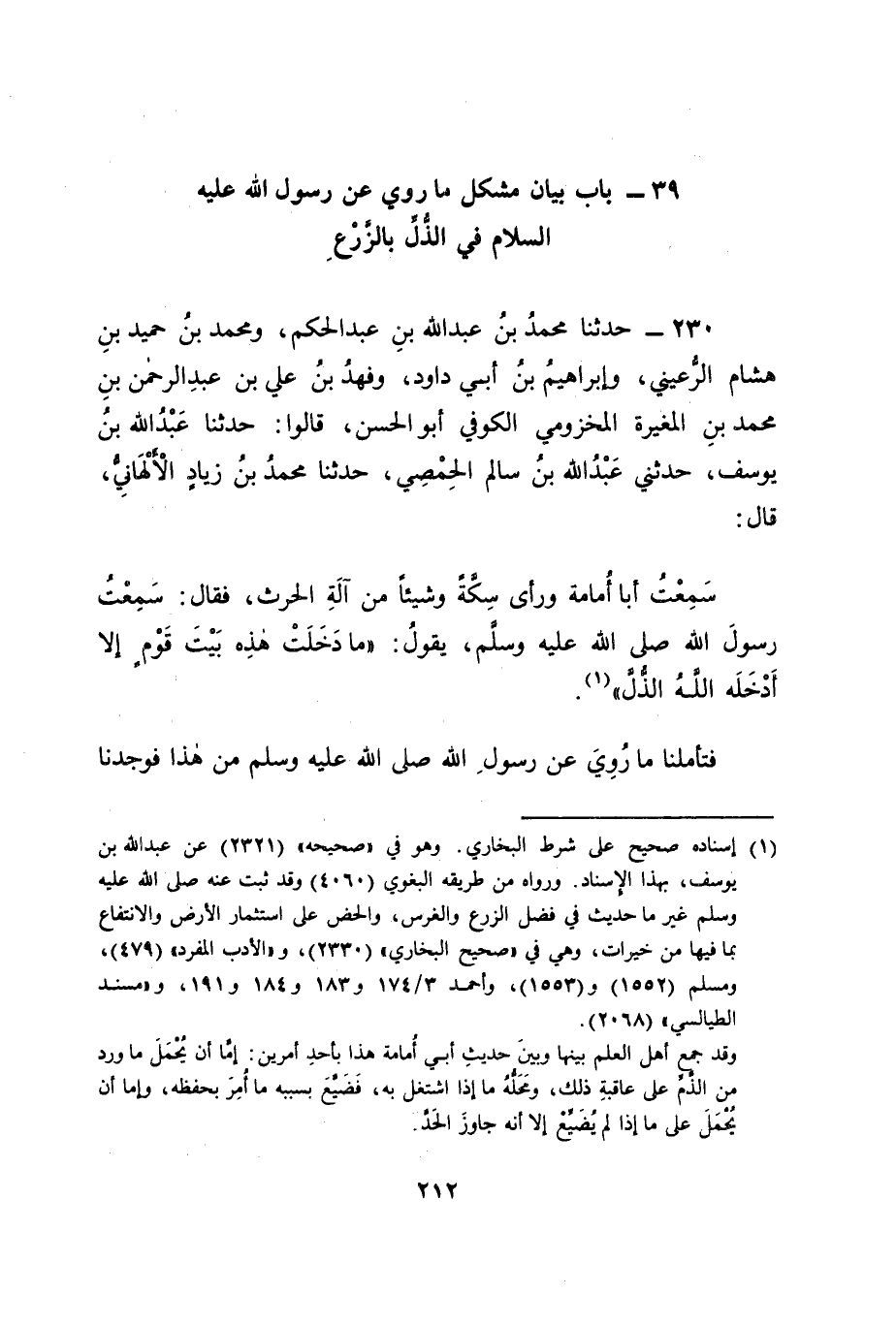 230 - حَدَّثَنَا مُحَمَّدُ بْنُ عَبْدِ اللهِ بْنِ عَبْدِ الْحَكَمِ، وَمُحَمَّدُ بْنُ حُمَيْدِ بْنِ هِشَامٍ الرُّعَيْنِيُّ، وَإِبْرَاهِيمُ بْنُ أَبِي دَاوُدَ، وَفَهْدُ بْنُ عَلِيِّ بْنِ عَبْدِ الرَّحْمَنِ بْنِ مُحَمَّدِ بْنِ الْمُغِيرَةِ الْمَخْزُومِيُّ الْكُوفِيُّ أَبُو الْحَسَنِ، قَالُوا: حَدَّثَنَا عَبْدُ اللهِ بْنُ يُوسُفَ، حَدَّثَنِي عَبْدُ اللهِ بْنُ سَالِمٍ الْحِمْصِيُّ، حَدَّثَنَا مُحَمَّدُ بْنُ زِيَادٍ الْأَلْهَانِيُّ، قَالَ: سَمِعْتُ أَبَا أُمَامَةَ، وَرَأَى سِكَّةً وَشَيْئًا مِنْ آلَةِ الْحَرْثِ، فَقَالَ: سَمِعْتُ رَسُولَ اللهِ صَلَّى اللَّهُ عَلَيْهِ وَسَلَّمَ يَقُولُ: " مَا دَخَلَتْ هَذِهِ بَيْتَ قَوْمٍ إلَّا أَدْخَلَهُ اللهُ الذُّلَّ " فَتَأَمَّلْنَا مَا رُوِيَ عَنْ رَسُولِ اللهِ صَلَّى اللَّهُ عَلَيْهِ وَسَلَّمَ مِنْ هَذَا فَوَجَدْنَا -[213]- وِلَايَةَ خَرَاجِ الْأَرْضِينَ وَجِبَايَةَ أَمْوَالِهَا وَوَضْعَهَا فِي مَوَاضِعَهَا الَّتِي يَجِبُ وَضْعُهَا فِيهَا إلَى الْمُسْلِمِينَ يَتَوَلَّاهُ مِنْهُمْ أَئِمَّتُهُمْ حَتَّى يَأْخُذُوهُ مِمَّنْ هُوَ عَلَيْهِ فَيَضَعُونَهُ فِيمَا يَجِبُ وَضْعُهُ فِيهِ وَكَانَ مَا تَوَلَّاهُ أَئِمَّةُ الْمُسْلِمِينَ لِلْمُسْلِمِينَ كَمَا تَوَلَّاهُ الْمُسْلِمُونَ لِأَنْفُسِهِمْ وَكَانَ مَنْ دَخَلَ فِيمَا يُوجِبُ الْخَرَاجَ عَلَيْهِ مِنَ الْمُسْلِمِينَ عَادَ بِهِ مَطْلُوبًا بِمَا كَانَ بِهِ قَبْلَ ذَلِكَ طَالِبًا فَكَانَ فِي ذَلِكَ دُخُولُ الذُّلِّ عَلَيْهِمْ. وَقَدْ رُوِيَ عَنْ رَسُولِ اللهِ صَلَّى اللَّهُ عَلَيْهِ وَسَلَّمَ مِمَّا أَخْبَرَ بِهِ عَنْ رِزْقِهِ , وَعَنِ انْتِقَالِ الذُّلِّ وَالصَّغَارِ عَنْهُ وَعَنْ لُزُومِهِمَا مُخَالَفَتَهُ