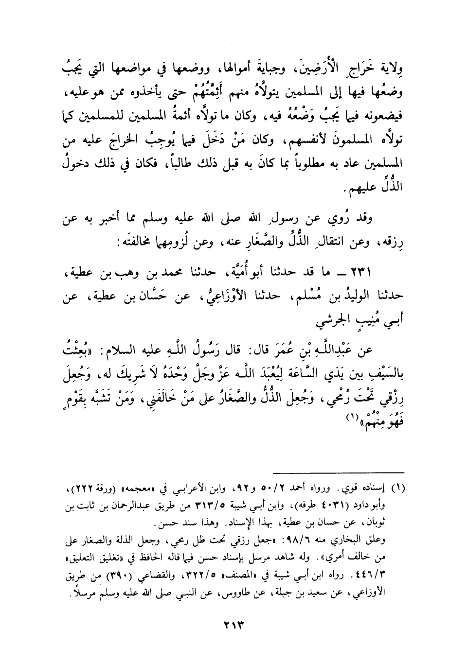 231 - مَا قَدْ حَدَّثَنَا أَبُو أُمَيَّةَ، حَدَّثَنَا مُحَمَّدُ بْنُ وَهْبِ بْنِ عَطِيَّةَ، حَدَّثَنَا الْوَلِيدُ بْنُ مُسْلِمٍ، حَدَّثَنَا الْأَوْزَاعِيُّ، عَنْ حَسَّانَ بْنِ عَطِيَّةَ، عَنْ أَبِي مُنِيبٍ الْجُرَشِيِّ، عَنْ عَبْدِ اللهِ بْنِ عُمَرَ، قَالَ: قَالَ رَسُولُ اللهِ عَلَيْهِ السَّلَامُ: " بُعِثْتُ بِالسَّيْفِ بَيْنَ يَدَيِ السَّاعَةِ لِيُعْبَدَ اللهُ عَزَّ وَجَلَّ وَحْدَهُ لَا شَرِيكَ لَهُ وَجُعِلَ رِزْقِي تَحْتَ رُمْحِي وَجُعِلَ الذُّلُّ وَالصَّغَارُ عَلَى مَنْ خَالَفَنِي وَمَنْ تَشَبَّهَ بِقَوْمٍ فَهُوَ مِنْهُمْ "