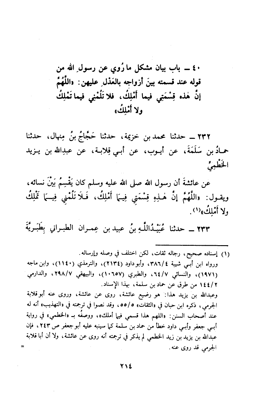 232 - حَدَّثَنَا مُحَمَّدُ بْنُ خُزَيْمَةَ، ثنا حَجَّاجُ بْنُ مِنْهَالٍ، ثنا حَمَّادُ بْنُ سَلَمَةَ، عَنْ أَيُّوبَ، عَنْ أَبِي قِلَابَةَ، عَنْ عَبْدِ اللهِ بْنِ يَزِيدَ الْخِطْمِيِّ، عَنْ عَائِشَةَ، أَنَّ رَسُولَ اللهِ صَلَّى اللَّهُ عَلَيْهِ وَسَلَّمَ كَانَ يَقْسِمُ بَيْنَ نِسَائِهِ وَيَقُولُ: " اللهُمَّ إنَّ هَذِهِ قِسْمَتِي فِيمَا أَمْلِكُ فَلَا تَلُمْنِي فِيمَا تَمْلِكُ وَلَا أَمْلِكُ "
