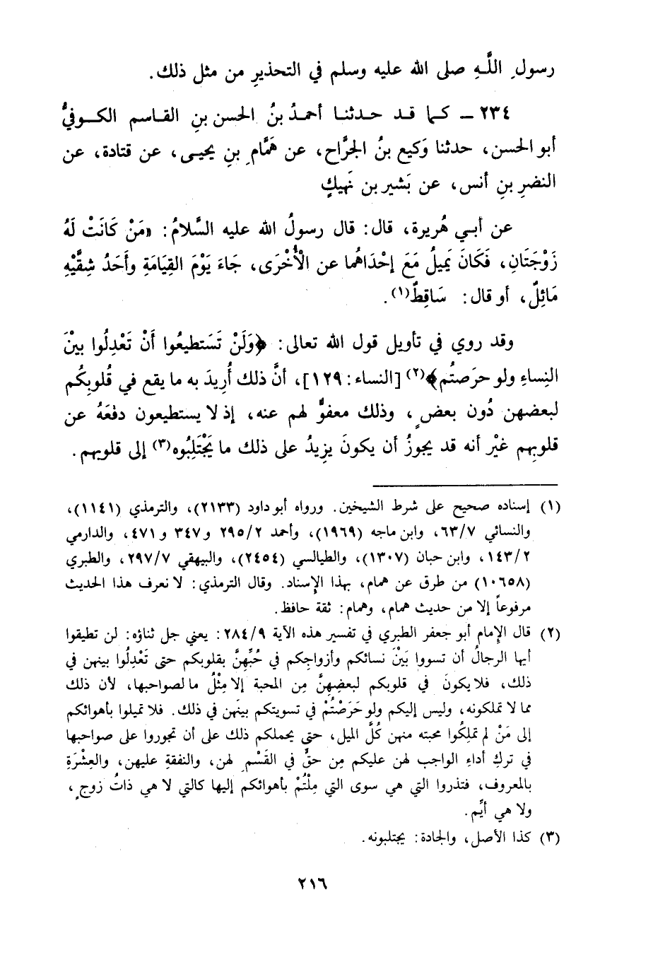 234 - كَمَا قَدْ حَدَّثَنَا أَحْمَدُ بْنُ الْحَسَنِ بْنِ الْقَاسِمِ الْكُوفِيُّ أَبُو الْحَسَنِ، حَدَّثَنَا وَكِيعُ بْنُ الْجَرَّاحِ، عَنْ هَمَّامِ بْنِ يَحْيَى، عَنْ قَتَادَةَ، عَنِ النَّضْرِ بْنِ أَنَسٍ، عَنْ بَشِيرِ بْنِ نَهِيكٍ، عَنْ أَبِي هُرَيْرَةَ، قَالَ قَالَ رَسُولُ اللهِ عَلَيْهِ السَّلَامُ: " مَنْ كَانَتْ لَهُ زَوْجَتَانِ فَكَانَ يَمِيلُ مَعَ إحْدَاهُمَا عَنِ الْأُخْرَى جَاءَ يَوْمَ الْقِيَامَةِ وَأَحَدُ شِقَّيْهِ مَائِلٌ، أَوْ قَالَ: سَاقِطٌ " وَقَدْ رُوِيَ فِي تَأْوِيلِ قَوْلِ اللهِ تَعَالَى: {وَلَنْ تَسْتَطِيعُوا أَنْ تَعْدِلُوا بَيْنَ النِّسَاءِ وَلَوْ حَرَصْتُمْ} [النساء: 129] . أَنَّ ذَلِكَ أُرِيدَ بِهِ مَا يَقَعُ فِي قُلُوبِكُمْ لِبَعْضِهِنَّ دُونَ بَعْضٍ , وَذَلِكَ مَعْفُوٌّ لَهُمْ عَنْهُ إذْ لَا يَسْتَطِيعُونَ دَفْعَهُ عَنْ قُلُوبِهِمْ غَيْرَ أَنَّهُ قَدْ يَجُوزُ أَنْ يَكُونَ يَزِيدُ عَلَى ذَلِكَ مَا يَجْتَلِبُوهُ إلَى قُلُوبِهِمْ -[217]- فَكَانَ الَّذِي كَانَ مِنْ رَسُولِ اللهِ عَلَيْهِ السَّلَامُ مِمَّا أَرَادَهُ مِنْ رَبِّهِ عَلَى الْإِشْفَاقِ وَعَلَى الرَّهْبَةِ مِمَّا يَسْبِقُ إلَى قَلْبِهِ مِمَّا قَدْ يَسْتَطِيعُ رَدَّهُ عَنْهُ مَعَ قُرْبِهِ مِنْ غَلَبَتِهِ عَلَيْهِ , وَهَذَا عِنْدَنَا وَاللهُ أَعْلَمُ مِثْلُ الَّذِي فِي حَدِيثِ حُصَيْنٍ الْخُزَاعِيِّ مِمَّا قَدْ عَلَّمَهُ رَسُولُ اللهِ صَلَّى اللَّهُ عَلَيْهِ وَسَلَّمَ إيَّاهُ أَنْ يَدْعُوَ بِهِ رَبَّهُ تَعَالَى أَنْ يَغْفِرَ لَهُ مَا أَخْطَأَ، وَمَا تَعَمَّدَ، وَمَا أَخْطَأَهُ فَهُوَ غَيْرُ مَأْخُوذٍ بِهِ لَمَّا خَافَ عَلَيْهِ أَنْ يَكُونَ تَقَرُّبُهُ مِمَّا تَعَمَّدَهُ وَقَدْ رَوَيْنَا هَذَا الْحَدِيثَ فِيمَا تَقَدَّمَ مِنَّا فِي كِتَابِنَا هَذَا، وَاللهَ نَسْأَلُهُ التَّوْفِيقَ