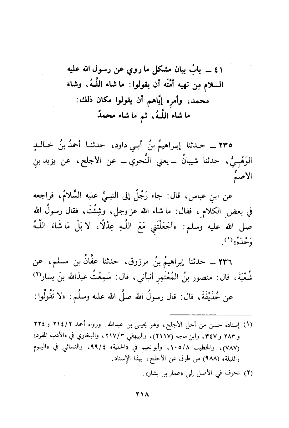235 - حَدَّثَنَا إبْرَاهِيمُ بْنُ أَبِي دَاوُدَ، حَدَّثَنَا أَحْمَدُ بْنُ خَالِدٍ الْوَهْبِيُّ، حَدَّثَنَا شَيْبَانُ يَعْنِي النَّحْوِيَّ، عَنِ الْأَجْلَحِ، عَنْ يَزِيدَ بْنِ الْأَصَمِّ، عَنِ ابْنِ عَبَّاسٍ، قَالَ: جَاءَ رَجُلٌ إلَى النَّبِيِّ عَلَيْهِ السَّلَامُ فَرَاجَعَهُ فِي بَعْضِ الْكَلَامِ، فَقَالَ: مَا شَاءَ اللهُ عَزَّ وَجَلَّ وَشِئْتَ فَقَالَ رَسُولُ اللهِ صَلَّى اللَّهُ عَلَيْهِ وَسَلَّمَ: " أَجَعَلْتَنِي مَعَ اللهِ عَدْلًا , لَا بَلْ مَا شَاءَ اللهُ وَحْدَهُ "