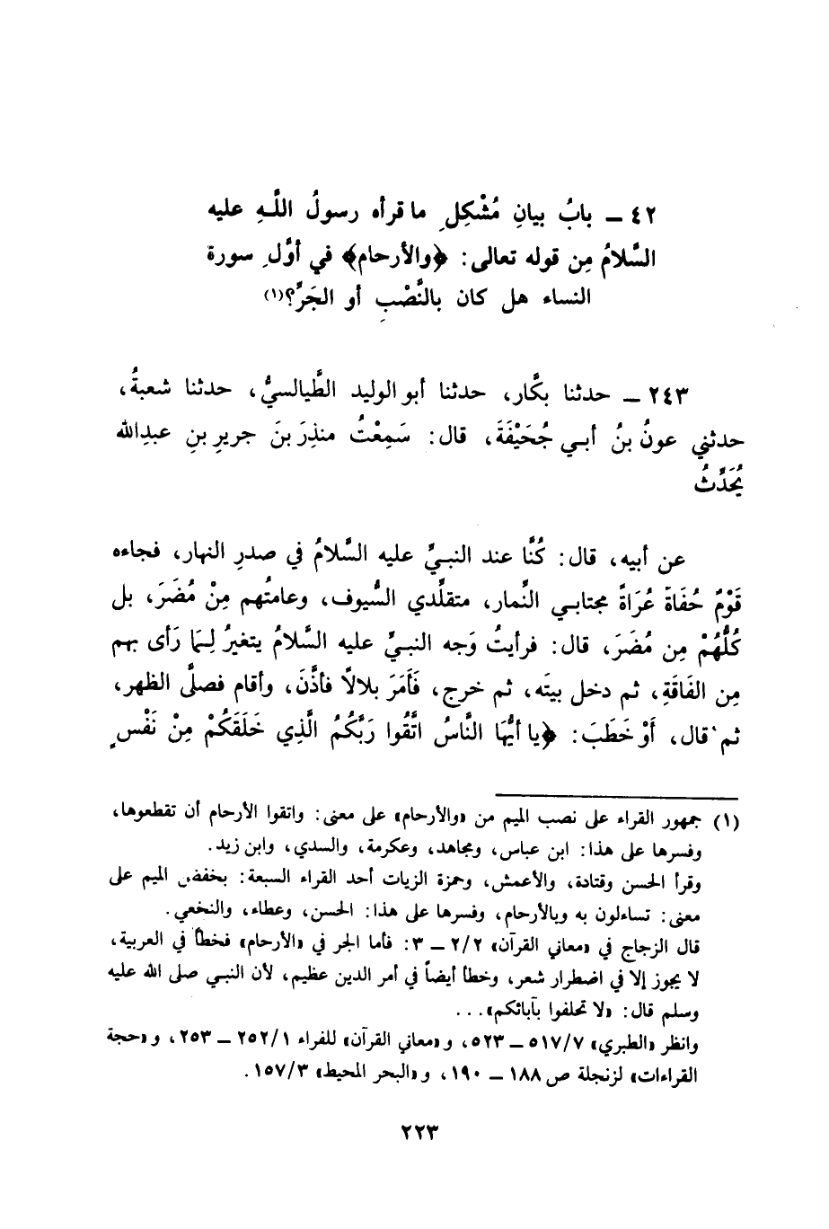 بَابُ بَيَانِ مُشْكِلِ مَا قَرَأَهُ رَسُولُ اللهِ عَلَيْهِ السَّلَامُ مِنْ قَوْلِهِ تَعَالَى: {وَالْأَرْحَامَ} [النساء: 1] فِي أَوَّلِ سُورَةِ النِّسَاءِ هَلْ كَانَ بِالنَّصْبِ أَوِ الْجَرِّ؟