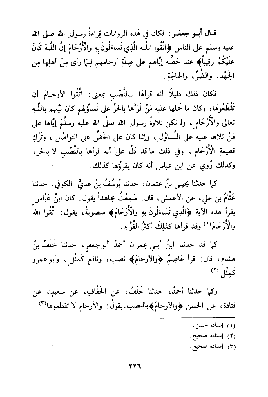 كَمَا قَدْ حَدَّثَنَا ابْنُ أَبِي عِمْرَانَ أَحْمَدُ أَبُو جَعْفَرٍ , حَدَّثَنَا خَلَفُ بْنُ هِشَامٍ قَالَ: " قَرَأَ عَاصِمٌ: {وَالْأَرْحَامَ} [النساء: 1] نَصَبَ، وَنَافِعٌ كَمِثْلِ، وَأَبُو عَمْرٍو كَمِثْلِ "