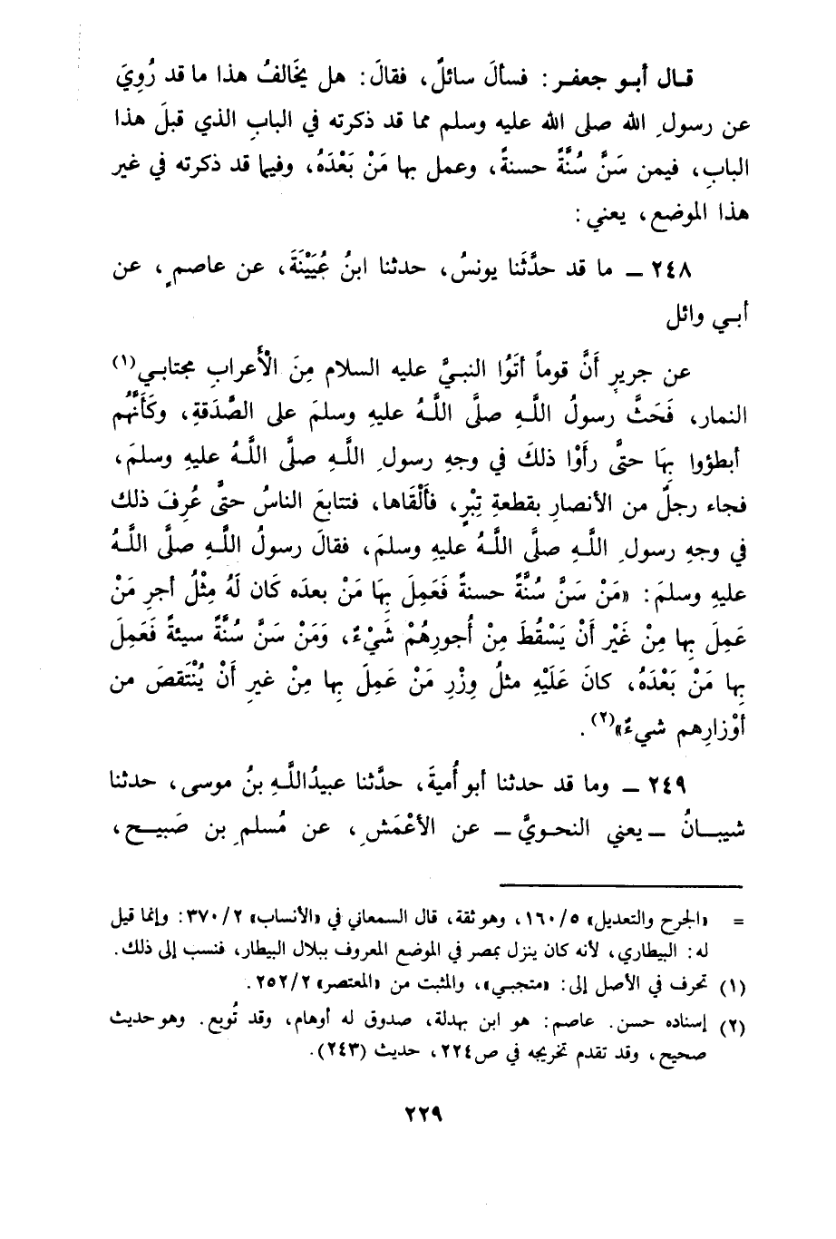 248 - مَا قَدْ حَدَّثَنَا يُونُسُ، حَدَّثَنَا ابْنُ عُيَيْنَةَ، عَنْ عَاصِمٍ، عَنْ أَبِي وَائِلٍ، عَنْ جَرِيرٍ، أَنَّ قَوْمًا أَتَوَا النَّبِيَّ عَلَيْهِ السَّلَامُ مِنَ الْأَعْرَابِ مُجْتَابِي النِّمَارِ فَحَثَّ رَسُولُ اللهِ صَلَّى اللَّهُ عَلَيْهِ وَسَلَّمَ عَلَى الصَّدَقَةِ وَكَأَنَّهُمْ أَبْطَئُوا بِهَا حَتَّى رَأَوْا ذَلِكَ فِي وَجْهِ رَسُولِ اللهِ صَلَّى اللَّهُ عَلَيْهِ وَسَلَّمَ فَجَاءَ رَجُلٌ مِنَ الْأَنْصَارِ بِقِطْعَةِ تِبْرٍ فَأَلْقَاهَا فَتَتَابَعَ النَّاسُ حَتَّى عُرِفَ ذَلِكَ فِي وَجْهِ رَسُولِ اللهِ صَلَّى اللَّهُ عَلَيْهِ وَسَلَّمَ فَقَالَ رَسُولُ اللهِ صَلَّى اللَّهُ عَلَيْهِ وَسَلَّمَ: " مَنْ سَنَّ سُنَّةً حَسَنَةً فَعَمِلَ بِهَا مَنْ بَعْدَهُ كَانَ لَهُ مِثْلُ أَجْرِ مَنْ عَمِلَ بِهَا مِنْ غَيْرِ أَنْ يَسْقُطَ مِنْ أُجُورِهِمْ شَيْءٌ وَمَنْ سَنَّ سُنَّةً سَيِّئَةً فَعَمِلَ بِهَا مَنْ بَعْدَهُ كَانَ عَلَيْهِ مِثْلُ وِزْرِ مَنْ عَمِلَ بِهَا مِنْ غَيْرِ أَنْ يُنْتَقَصَ مِنْ أَوْزَارِهِمْ شَيْءٌ "