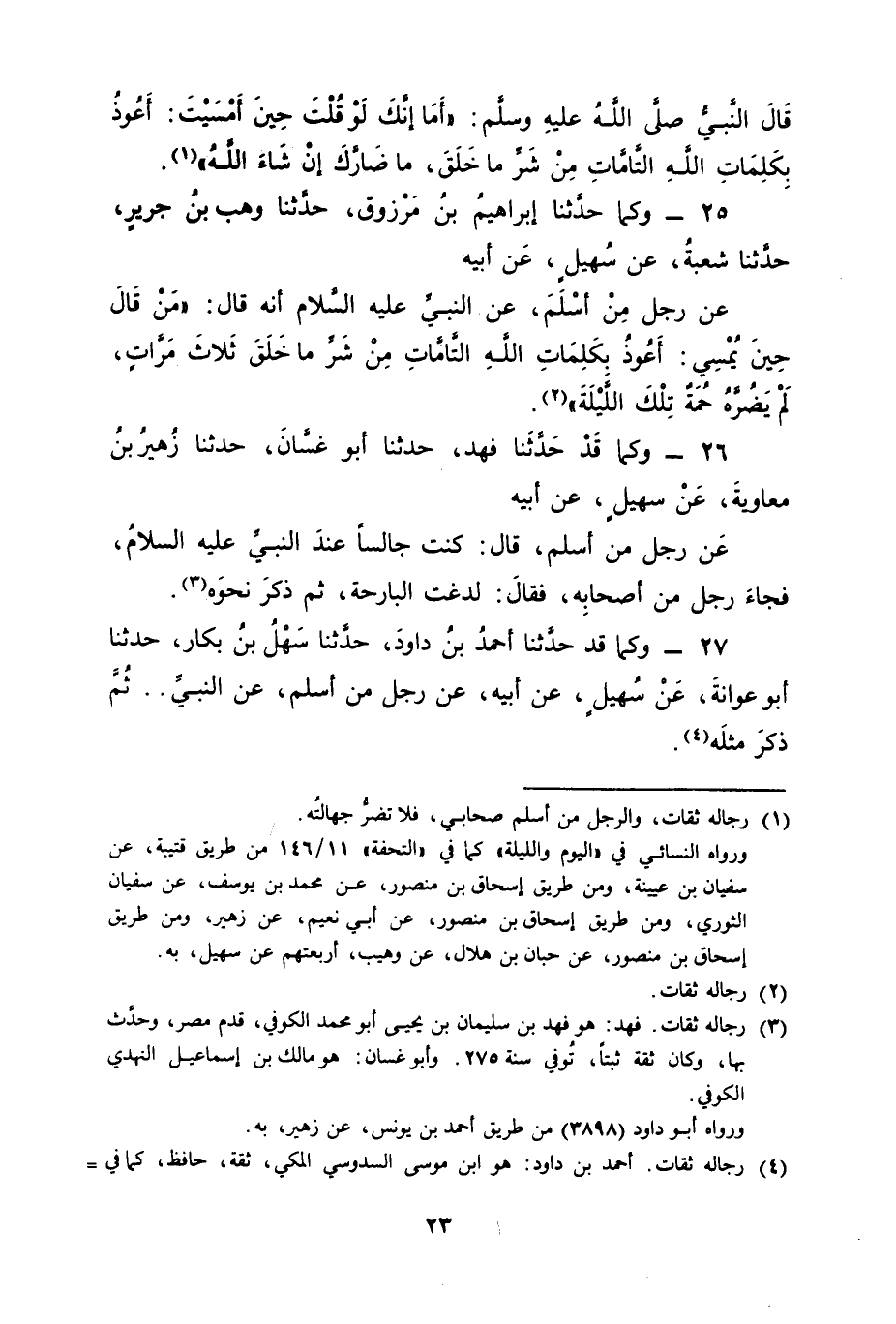 25 - وَكَمَا حَدَّثَنَا إبْرَاهِيمُ بْنُ مَرْزُوقٍ، حَدَّثَنَا وَهْبُ بْنُ جَرِيرٍ، حَدَّثَنَا شُعْبَةُ، عَنْ سُهَيْلٍ، عَنْ أَبِيهِ، عَنْ رَجُلٍ مِنْ أَسْلَمَ , عَنِ النَّبِيِّ عَلَيْهِ السَّلَامُ أَنَّهُ قَالَ: " مَنْ قَالَ حِينَ يُمْسِي: أَعُوذُ بِكَلِمَاتِ اللهِ التَّامَّاتِ مِنْ شَرِّ مَا خَلَقَ ثَلَاثَ مَرَّاتٍ , لَمْ يَضُرَّهُ حُمَّةٌ تِلْكَ اللَّيْلَةِ ".