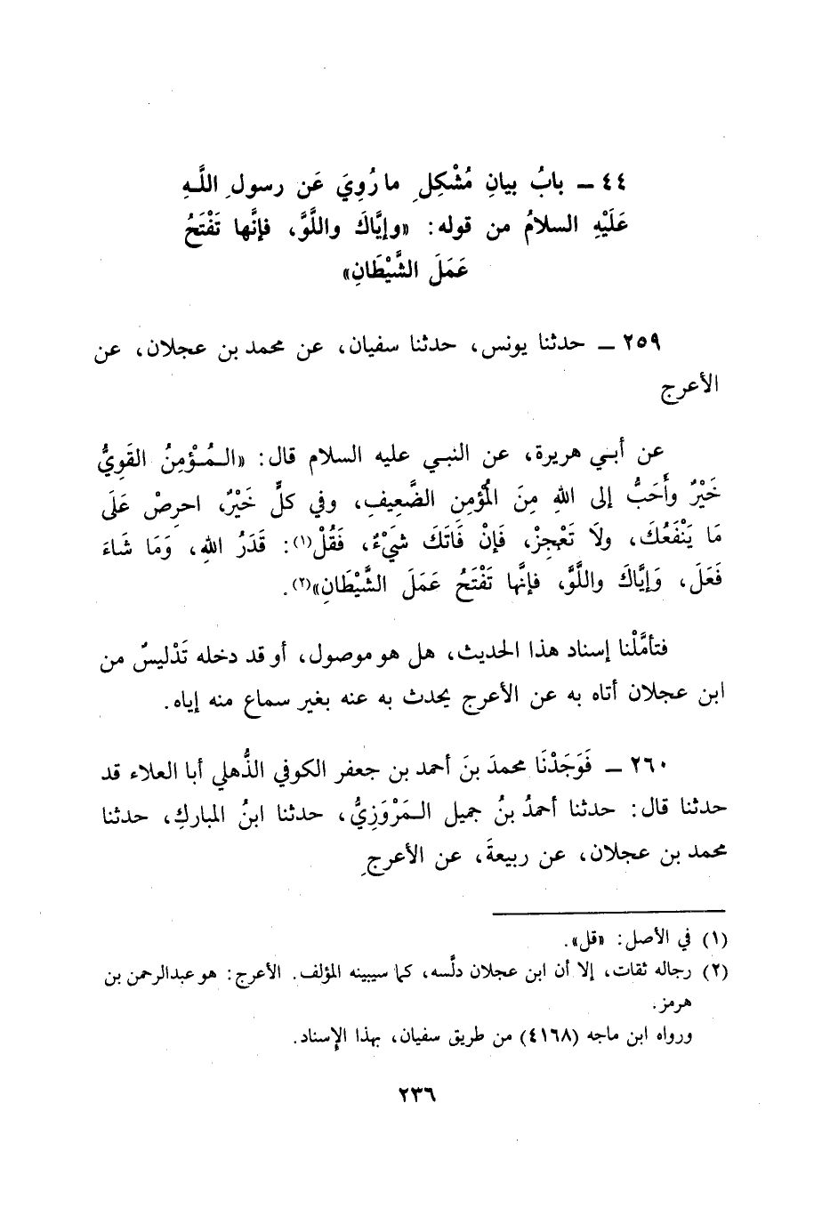 259 - حَدَّثَنَا يُونُسُ، حَدَّثَنَا سُفْيَانُ، عَنْ مُحَمَّدِ بْنِ عَجْلَانَ، عَنِ الْأَعْرَجِ، عَنْ أَبِي هُرَيْرَةَ، عَنْ النَّبِيِّ عَلَيْهِ السَّلَامُ قَالَ: " الْمُؤْمِنُ الْقَوِيُّ خَيْرٌ وَأَحَبُّ إلَى اللهِ مِنَ الْمُؤْمِنِ الضَّعِيفِ وَفِي كُلٍّ خَيْرٌ احْرِصْ عَلَى مَا يَنْفَعُكَ وَلَا تَعْجِزْ فَإِنْ فَاتَكَ شَيْءٌ فَقُلْ: قَدَّرَ اللهُ وَمَا شَاءَ فَعَلَ وَإِيَّاكَ وَاللَّوْ فَإِنَّهَا تَفْتَحُ عَمَلَ الشَّيْطَانِ " فَتَأَمَّلْنَا إسْنَادَ هَذَا الْحَدِيثِ هَلْ هُوَ مَوْصُولٌ أَوْ قَدْ دَخَلَهُ تَدْلِيسٌ مِنِ ابْنِ عَجْلَانَ أَتَاهُ بِهِ عَنِ الْأَعْرَجِ يُحَدِّثُ بِهِ عَنْهُ بِغَيْرِ سَمَاعٍ مِنْهُ إيَّاهُ