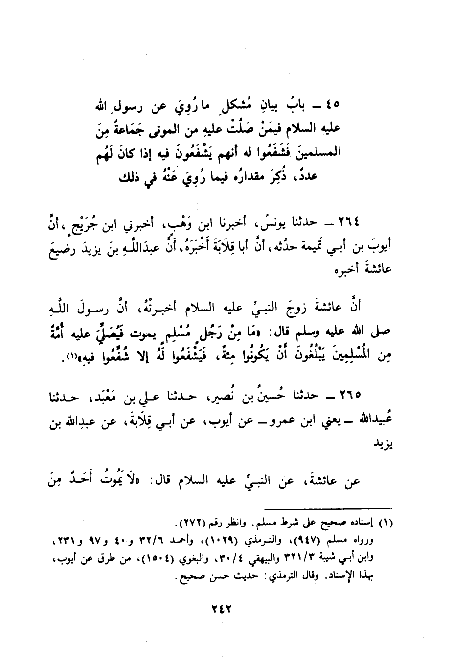 264 - حَدَّثَنَا يُونُسُ، أَخْبَرَنَا ابْنُ وَهْبٍ، أَخْبَرَنِي ابْنُ جُرَيْجٍ، أَنَّ أَيُّوبَ بْنَ أَبِي تَمِيمَةَ حَدَّثَهُ , أَنَّ أَبَا قِلَابَةَ أَخْبَرَهُ , أَنَّ عَبْدَ اللهِ بْنَ يَزِيدَ رَضِيعَ عَائِشَةَ أَخْبَرَهُ , أَنَّ عَائِشَةَ زَوْجَ النَّبِيِّ عَلَيْهِ السَّلَامُ أَخْبَرَتْهُ أَنَّ رَسُولَ اللهِ صَلَّى اللَّهُ عَلَيْهِ وَسَلَّمَ قَالَ: " مَا مِنْ رَجُلٍ مُسْلِمٍ يَمُوتُ فَيُصَلِّي عَلَيْهِ أُمَّةٌ مِنَ الْمُسْلِمِينَ يَبْلُغُونَ أَنْ يَكُونُوا مِائَةً فَيَشْفَعُوا لَهُ إلَّا شُفِّعُوا فِيهِ "