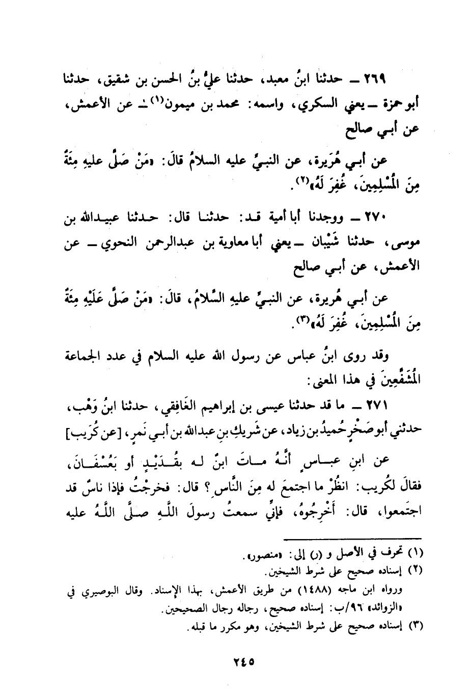 269 - حَدَّثَنَا ابْنُ مَعْبَدٍ، حَدَّثَنَا عَلِيُّ بْنُ الْحَسَنِ بْنِ شَقِيقٍ، حَدَّثَنَا أَبُو حَمْزَةَ يَعْنِي السُّكَّرِيَّ وَاسْمُهُ مُحَمَّدُ بْنُ مَيْمُونٍ، عَنِ الْأَعْمَشِ، عَنْ أَبِي صَالِحٍ، عَنْ أَبِي هُرَيْرَةَ , عَنِ النَّبِيِّ عَلَيْهِ السَّلَامُ قَالَ: " مَنْ صَلَّى عَلَيْهِ مِائَةٌ مِنَ الْمُسْلِمِينَ غُفِرَ لَهُ "